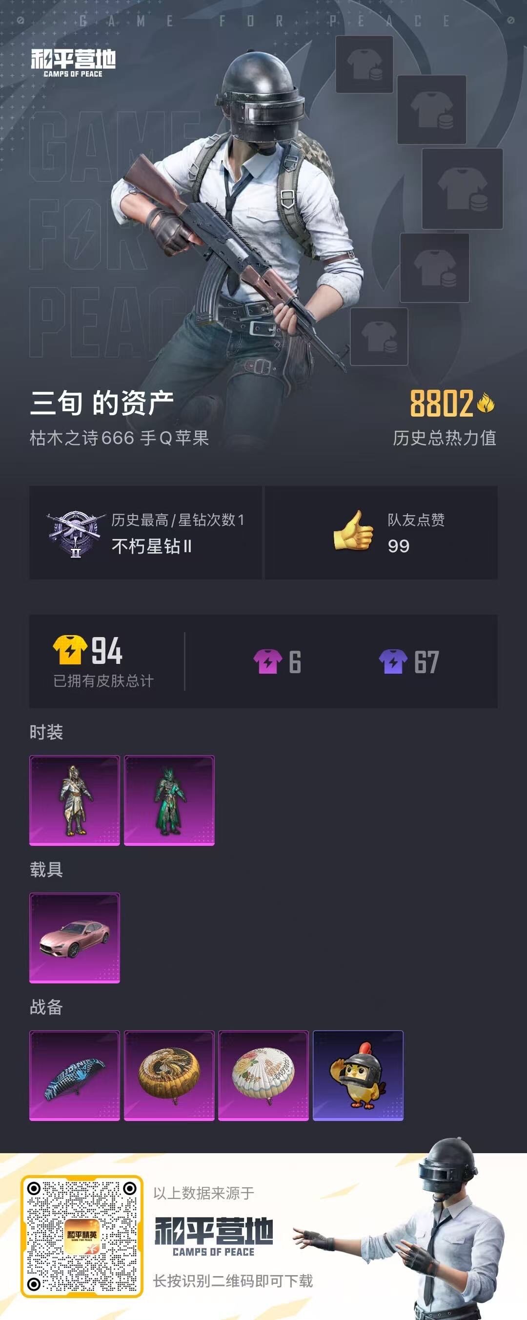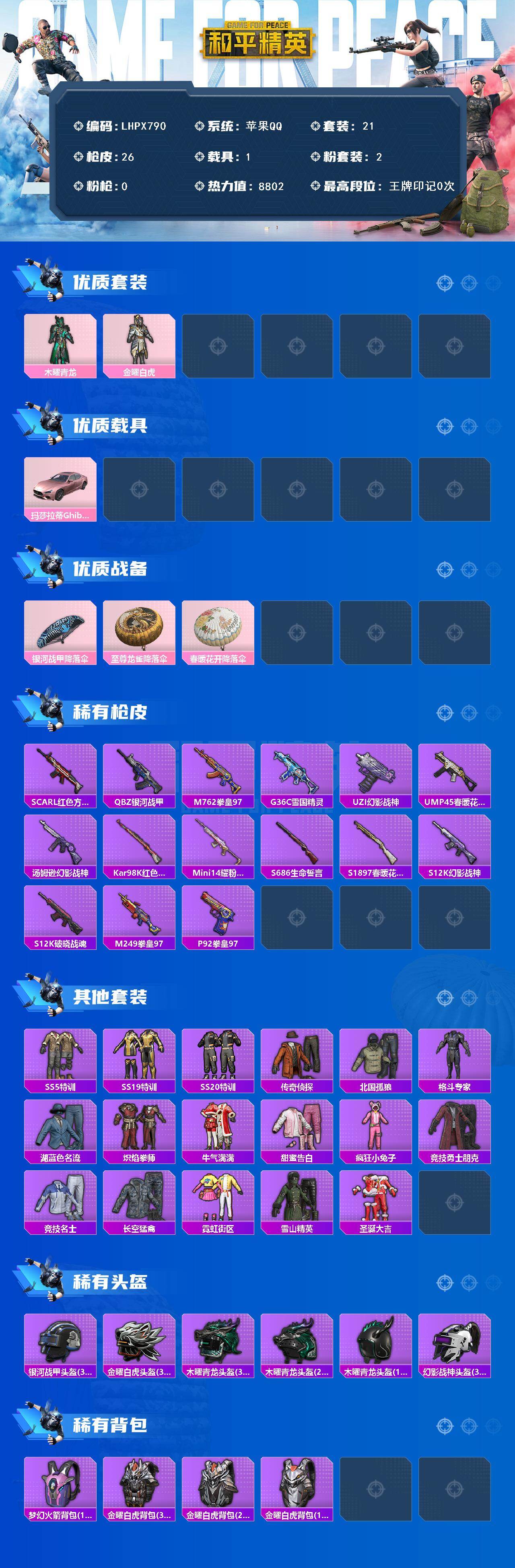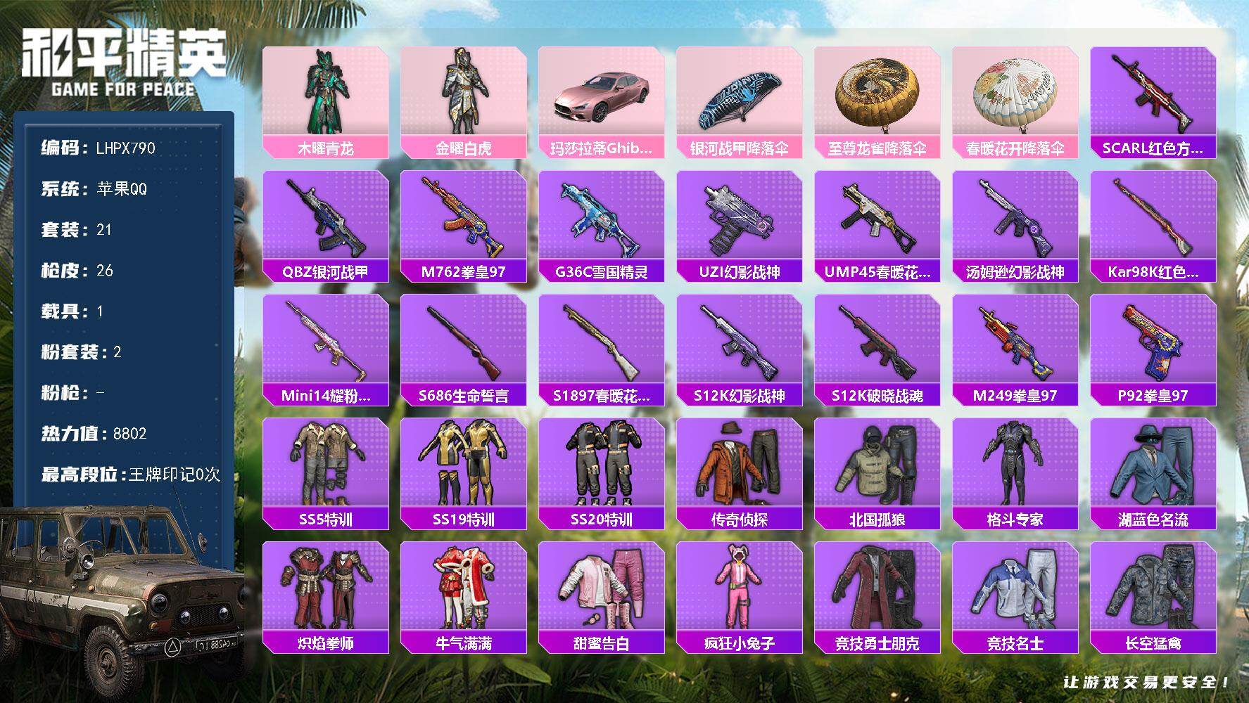 [16043799]【特价出售/店主推荐】苹果 手Q-2粉装-0特效枪-1载具-0粉色飞行器-8802热力值-2王牌印记-21套装-26枪皮 【粉色套装】:粉装-木曜青龙,粉装-金曜白虎 【粉色载具】:玛莎拉蒂Ghibli(粉) 【粉色降落伞】:银河战甲降落伞,至尊龙雀降落伞,春暖花开降落伞 【稀有枪皮】:SCAR-L-红色方程式,QBZ-银河战甲,M762-拳皇97,G36C-雪国精灵,UZI-幻影战神,UMP45-春暖花开,汤姆逊-幻影战神,Kar98K-红色方程式,Mini14-耀粉歌者,S686-生命誓言,S1897-春暖花开,S12K-破晓战魂,S12K-幻影战神,M249-拳皇97,P92-拳皇97 【其他套装】:套装-SS5特训,套装-SS19特训,套装-SS20特训,套装-传奇侦探,套装-北国孤狼,套装-格斗专家,套装-湖蓝色名流,套装-炽焰拳师,套装-牛气满满,套装-甜蜜告白,套装-疯狂小兔子,套装-竞技勇士朋克,套装-竞技名士,套装-长空猛禽,套装-霓虹街区,套装-雪山精英,套装-圣诞大吉 【稀有头盔】:银河战甲头盔(3级),金曜白虎头盔(3级),木曜青龙头盔(3级),木曜青龙头盔(2级),木曜青龙头盔(1级),幻影战神头盔(3级) 【稀有背包】:梦幻火箭背包(1级),金曜白虎背包(3级),金曜白虎背包(2级),金曜白虎背包(1级) 【营地ID】:786603514