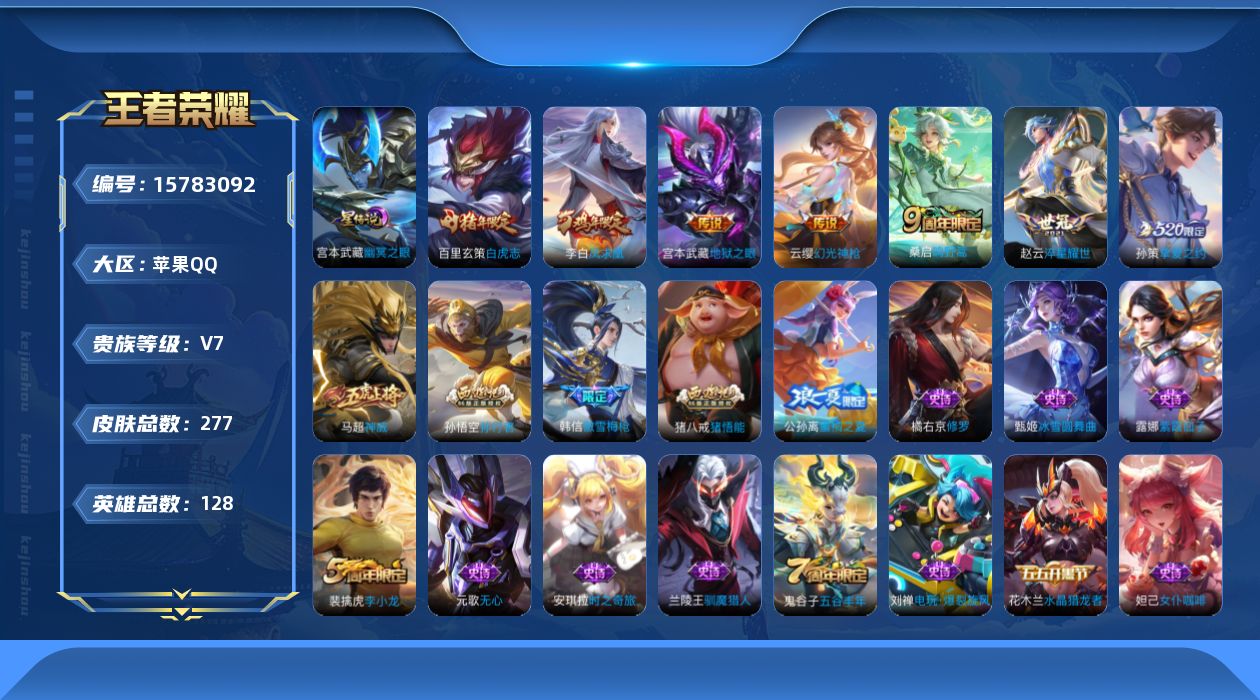 [15783092]按键2苹果Q-V7-277皮肤-1典藏英雄-7传说-67史诗 【英雄全皮】:蒙恬全皮,影全皮 【荣耀典藏】:武则天英雄 【传说皮肤】:云缨幻光神枪,桑启鸣野蒿,孙策挚爱之约,赵云淬星耀世,百里玄策白虎志,李白凤求凰,宫本武藏地狱之眼 【限定皮肤】:白起狰,姜子牙天穹之誓,狄仁杰阴阳师,虞姬凯尔特女王,赵云皇家上将,嬴政优雅恋人,嬴政白昼王子,鲁班七号狮舞东方,庄周蜃楼王,庄周高山流水,高渐离死亡摇滚,钟无艳王者之锤,孙膑妖精王,扁鹊炼金王,芈月重明,吕布猎兽之王,周瑜赤莲之焰,元歌无心,夏侯惇朔风刀,甄姬游园惊梦,曹操烛龙,典韦穷奇,狄仁杰魔术师,狄仁杰万华元夜,达摩沙漠行僧,项羽海滩派对,老夫子醍醐杖,程咬金演武夺筹,韩信逐梦之影,韩信傲雪梅枪,兰陵王驯魔猎人,兰陵王金庭之子,亚瑟狮心王,孙悟空美猴王,孙悟空孙行者,牛魔御旌,后羿圣弓游侠,李元芳银河之约,李元芳云中旅人,钟馗神迹守卫,钟馗驱傩正仪,杨玉环遇见飞天,女娲朔望之晖,干将莫邪真爱魔法,雅典娜单词大作战,雅典娜黎明之约,太乙真人饕餮,鬼谷子原初探秘者,鬼谷子五谷丰年,苏烈千军破阵,百里玄策白虎志,百里玄策原初追逐者,弈星混沌棋,梦奇顽趣,公孙离蜜橘之夏,沈梦溪星空之诺,沈梦溪大漠名商,明世隐疑决卦,裴擒虎李小龙,裴擒虎擒涛扼浪,狂铁御狮,米莱狄御霄,云中君纤云弄巧,盾山御銮,孙策挚爱之约,猪八戒猪悟能,上官婉儿梁祝,蒙犽狂想玩偶喵,鲁班大师探海日志,桑启海盐诗旅,艾琳女武神,张良古海寻踪,蒙恬荣光圣徽,鬼谷子天穹祈灯 【年限皮肤】:百里玄策白虎志,孙悟空美猴王,李白凤求凰,马超神威 【赛季限定】:庄周蜃楼王,孙膑妖精王,扁鹊炼金王,白起狰,芈月重明,夏侯惇朔风刀,曹操烛龙,典韦穷奇,狄仁杰万华元夜,达摩沙漠行僧,老夫子醍醐杖,程咬金演武夺筹,兰陵王金庭之子,张良古海寻踪,亚瑟狮心王,牛魔御旌,李元芳云中旅人,虞姬凯尔特女王,钟馗驱傩正仪,雅典娜黎明之约,太乙真人饕餮,鬼谷子原初探秘者,苏烈千军破阵,百里玄策原初追逐者,弈星混沌棋,梦奇顽趣,沈梦溪大漠名商,明世隐疑决卦,裴擒虎擒涛扼浪,狂铁御狮,米莱狄御霄,盾山御銮,鲁班大师探海日志,桑启海盐诗旅,鬼谷子天穹祈灯,蒙恬荣光圣徽,姜子牙天穹之誓 【战令限定】:嬴政白昼王子,鲁班七号狮舞东方,吕布猎兽之王,周瑜赤莲之焰,兰陵王驯魔猎人,后羿圣弓游侠,李元芳银
