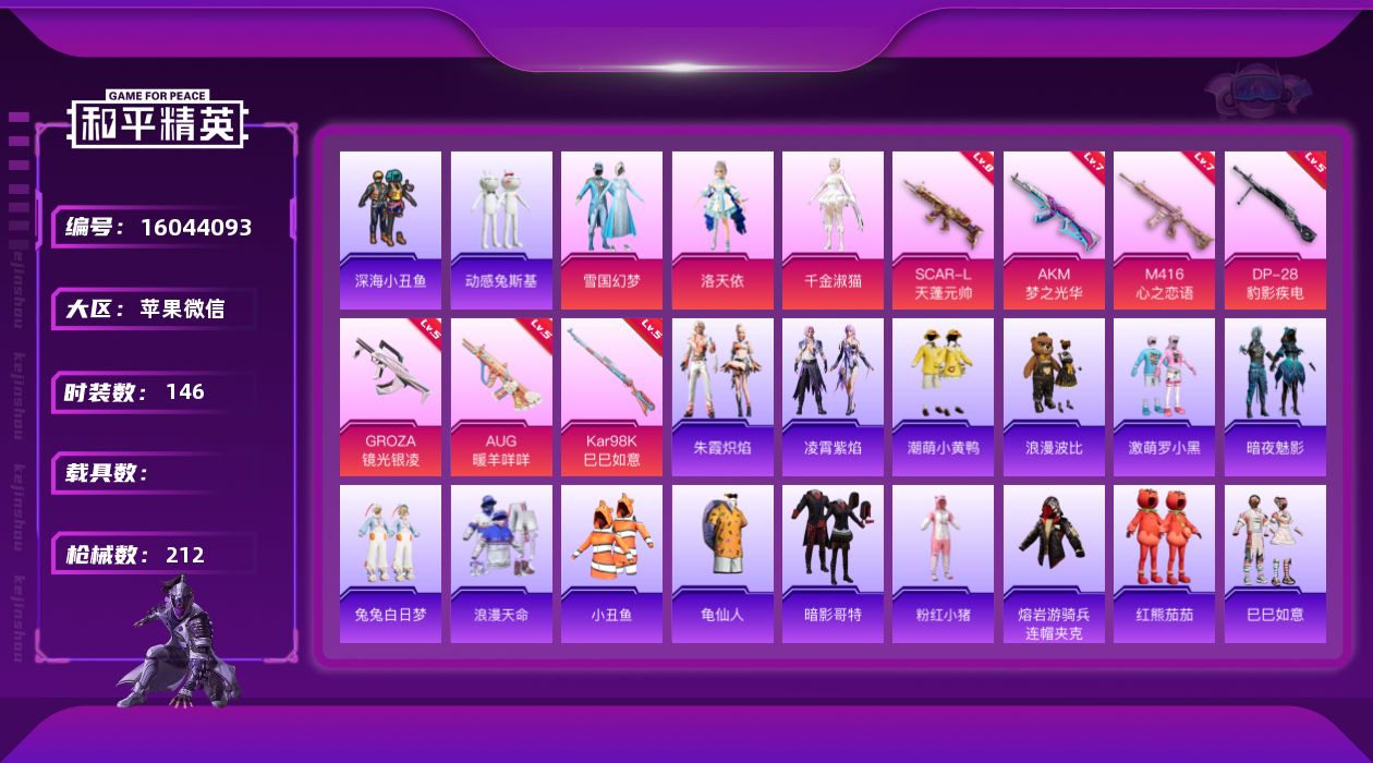 [16044093]可二次【特价出售/店主推荐】苹果 微信-无敌战神框-3粉装-7特效枪-0载具-3粉色飞行器-63541热力值-15王牌印记-146套装-212枪皮