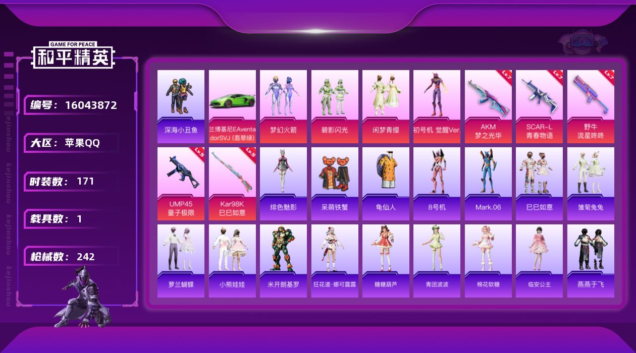 [16043872]【店主推荐捡漏号!可直接换绑】苹果 手Q-4粉装-5特效枪-1载具-0粉色飞行器-77137热力值-13王牌印记-171套装-242枪皮【热门品类】:粉装-梦幻火箭,套装-深海小丑鱼,套装-龟仙人,角色-8号机,角色-Mark.06【粉色套装】:粉装-梦幻火箭,粉装-碧影闪光,粉装-闲梦青缨,角色-初号机 觉醒Ver.【粉色枪皮等级】:AKM-梦之光华(七级),SCAR-L-青春物语(七级),UMP45-量子极限(五级),野牛-流星咚咚(七级),Kar98K-巳巳如意(五级)【粉色载具】:兰博基尼Aventador SVJ(翡翠绿)【粉色枪皮】:AKM-梦之光华,SCAR-L-青春物语,UMP45-量子极限,野牛-流星咚咚,Kar98K-巳巳如意