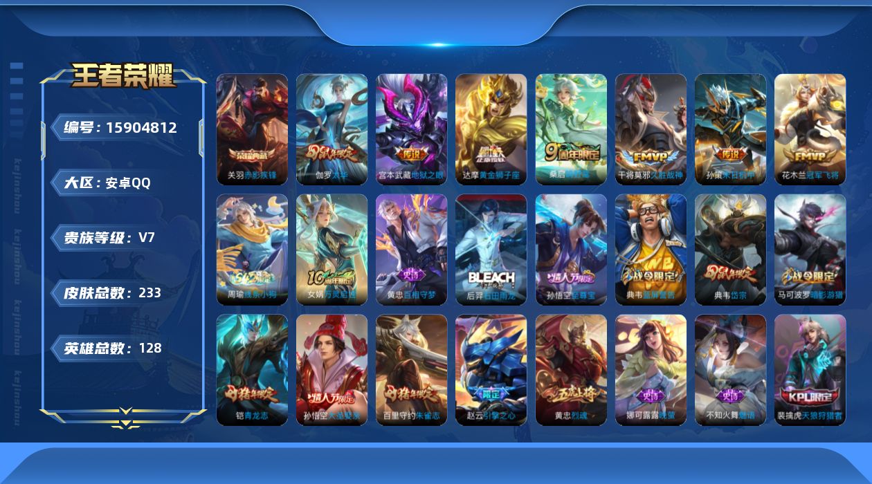- [11403333]实名: 可修改 性别: 男号 贵族等级: V4 英雄数: 124 皮肤数: 120 荣耀水晶: 鸣剑·曳影 传说皮: 黄金白羊座 限定皮: 李小龙,孙行者,五谷丰年,鸣野蒿,愿照·九州拓