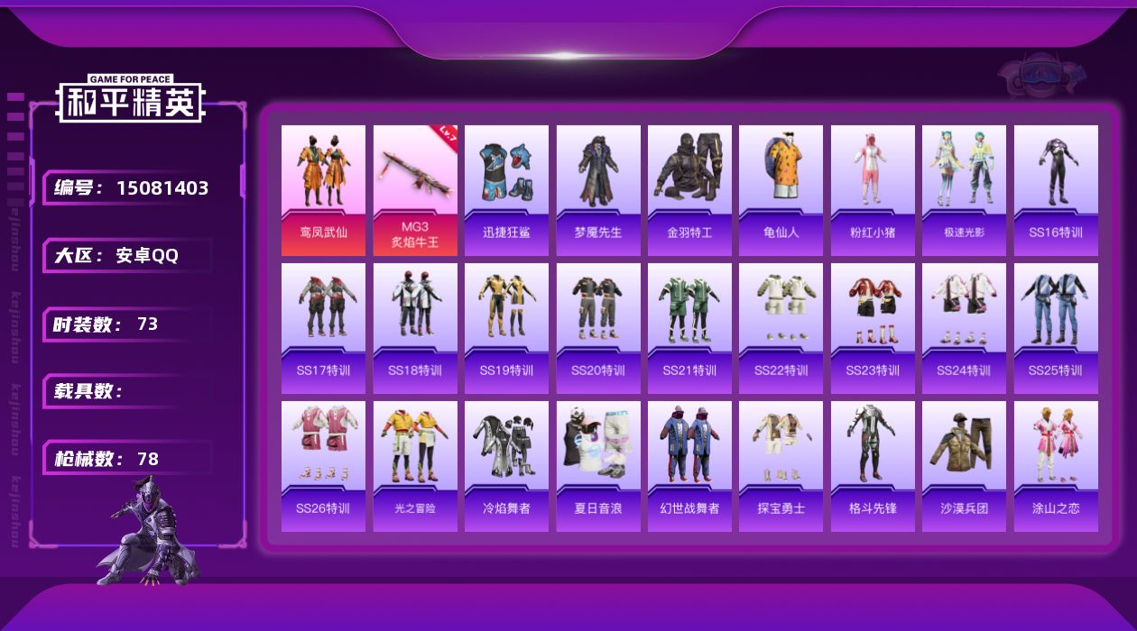[15081403]安卓 手Q-1粉装-1特效枪-0载具-0粉色飞行器-23784热力值-6王牌印记-73套装-78枪皮