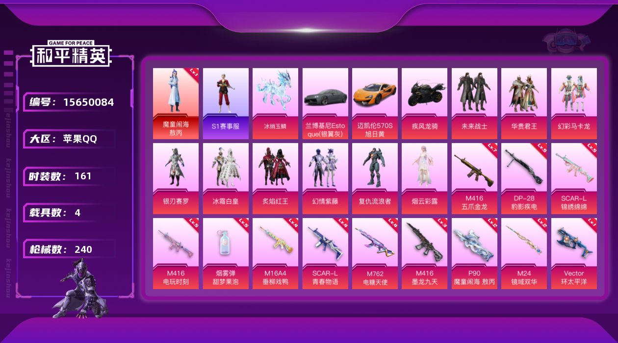 [15650084]【店主推荐捡漏号!可直接换绑】苹果 手Q-1神装-9粉装-13特效枪-4载具-6粉色飞行器-82580热力值-15王牌印记-161套装-240枪皮【红色神装等级】:魔童闹海-敖丙(一级)【红色角色神装】:魔童闹海-敖丙【热门品类】:套装-S1赛事,角色-军刀雅典娜,套装-SS1特训,旭日初心兜帽大衣,套装-龟仙人,套装-粉红小猪,角色-Mark.06【粉色套装】:粉装-未来战士,粉装-华贵君王,粉装-幻彩马卡龙,粉装-银刃赛罗,粉装-冰霜白皇,粉装-炙焰红王,粉装-幻情紫藤,角色-复仇流浪者,角色-烟云彩露【粉色枪皮等级】:M16A4-垂柳戏鸭(四级),SCAR-L-青春物语(四级),SCAR-L-锦绣绵绵(五级),M416-五爪金龙(七级),M416-电玩时刻(五级),M416-墨龙九天(三级),M762-电糖天使(四级),Vector-环太平洋(一级),P90-魔童闹海 敖丙(二级),M24-镜域双华(二级),DP-28-豹影疾电(五级),烟雾弹-甜梦果泡(五级)【粉色载具】:兰博基尼Estoque(银翼灰),迈凯伦570S(旭日黄),疾风龙骑,冰绡玉鳞【粉色枪皮】:M16A4-垂柳戏鸭,SCAR-L-青春物语,SCAR-L-锦绣绵绵,M416-五爪金龙,M416-电玩时刻,M416-墨龙九天,M762-电糖天使,Vector-环太平洋,P90-魔童闹海 敖丙,Kar98K-暗翼战神,M24-镜域双华,DP-28-豹影疾电,烟雾弹-甜梦果泡【粉色飞行器】:炫紫旋律飞行器,潮汐统领飞行器,镜域双华-灵镜之阶,龙翔九天飞行器,灵珠游龙飞行器