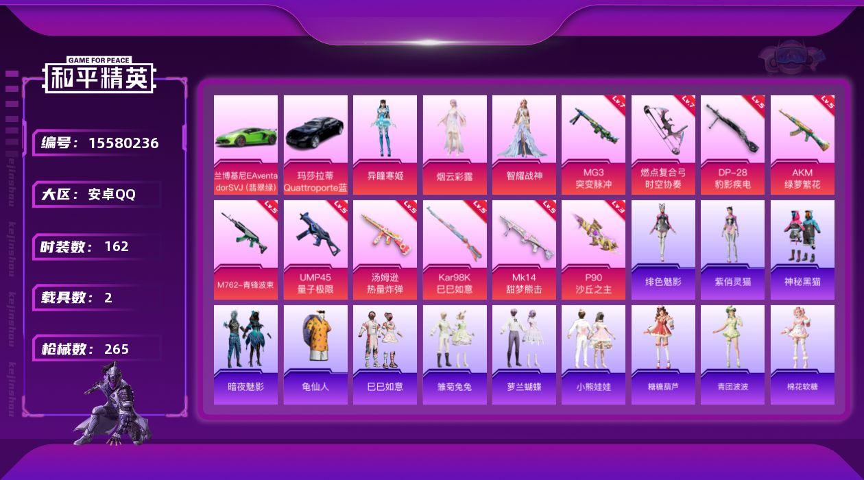 [15580236]安卓 手Q-3粉装-10特效枪-2载具-3粉色飞行器-78639热力值-14王牌印记-162套装-265枪皮