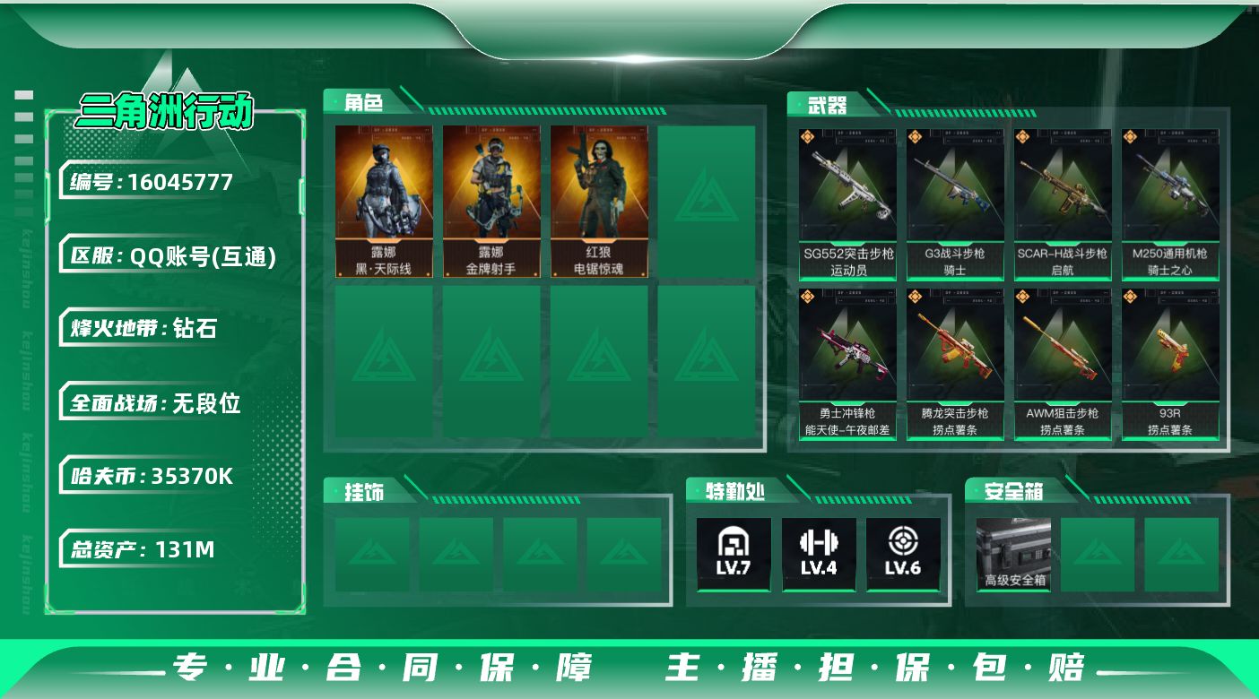 [16045777]【特价出售/店主推荐】131m总资产-35370k哈伏币-60烽火等级-钻石-5战场等级-无军衔 【干员外观】:露娜-黑·天际线,红狼-电锯惊魂,露娜-金牌射手 【近战皮肤】:近战-黑鹰 【传说外观】:M4A1突击步枪-阿米娅,SG552突击步枪-运动员,SCAR-H战斗步枪-启航,G3战斗步枪-骑士,CAR-15突击步枪-阿米娅,腾龙突击步枪-捞点薯条,勇士冲锋枪-能天使-午夜邮差,M250通用机枪-骑士之心,AWM狙击步枪-捞点薯条,93R-捞点薯条,复合弓-黑·天际线 【史诗外观】:ASh-12战斗步枪-无极限,AUG突击步枪-蝮蛇,M7战斗步枪-百步穿杨,G3战斗步枪-流沙送葬,AS Val突击步枪-百步穿杨,腾龙突击步枪-猎鳄行动,K437突击步枪-守护者,MP5冲锋枪-战术竞备,MP5冲锋枪-竞技风,P90冲锋枪-莫斯提马,Vector冲锋枪-百步穿杨,Vector冲锋枪-异域战争,SR-3M紧凑突击步枪-战术竞备,勇士冲锋枪-工业狂潮,MP7冲锋枪-守护者,Mini-14射手步枪-守护者,SVD狙击步枪-阿萨拉工艺,SV-98狙击步枪-林中猎手,SV-98狙击步枪-囚徒,M700狙击步枪-蝮蛇,M700狙击步枪-百步穿杨,AWM狙击步枪-无极限,AWM狙击步枪-流沙送葬,沙漠之鹰-曙光,复合弓-守护者 【稀有外观】:M4A1突击步枪-繁盛,AKM突击步枪-战术演练,AKM突击步枪-肃杀,QBZ95-1突击步枪-公平竞技,ASh-12战斗步枪-繁盛,M7战斗步枪-捣蛋鬼,SCAR-H战斗步枪-荣耀列队,SCAR-H战斗步枪-黄昏,G3战斗步枪-战术演练,G3战斗步枪-主宰,MP5冲锋枪-弄臣,MP5冲锋枪-哈夫克卫队,P90冲锋枪-黄昏,P90冲锋枪-捣蛋鬼,Vector冲锋枪-先锋,UZI冲锋枪-亚特兰蒂斯,野牛冲锋枪-前沿科技,SMG-45-行动开启,SMG-45冲锋枪-幻影结构,SMG-45冲锋枪-天网,勇士冲锋枪-主宰,勇士冲锋枪-冰天雪地,MP7冲锋枪-钢铁之躯,M1014霰弹枪-幻影结构,S12K霰弹枪-战术演练,QJB201轻机枪-黄昏,QJB201轻机枪-哈夫克卫队,Mini-14射手步枪-荣耀列队,SKS射手步枪-弄臣,SR-25射手步枪-开拓,SR-9射手步枪-街头涂鸦,PSG-1射手步枪-主宰,G18-星链科技,G18-哈夫克航天