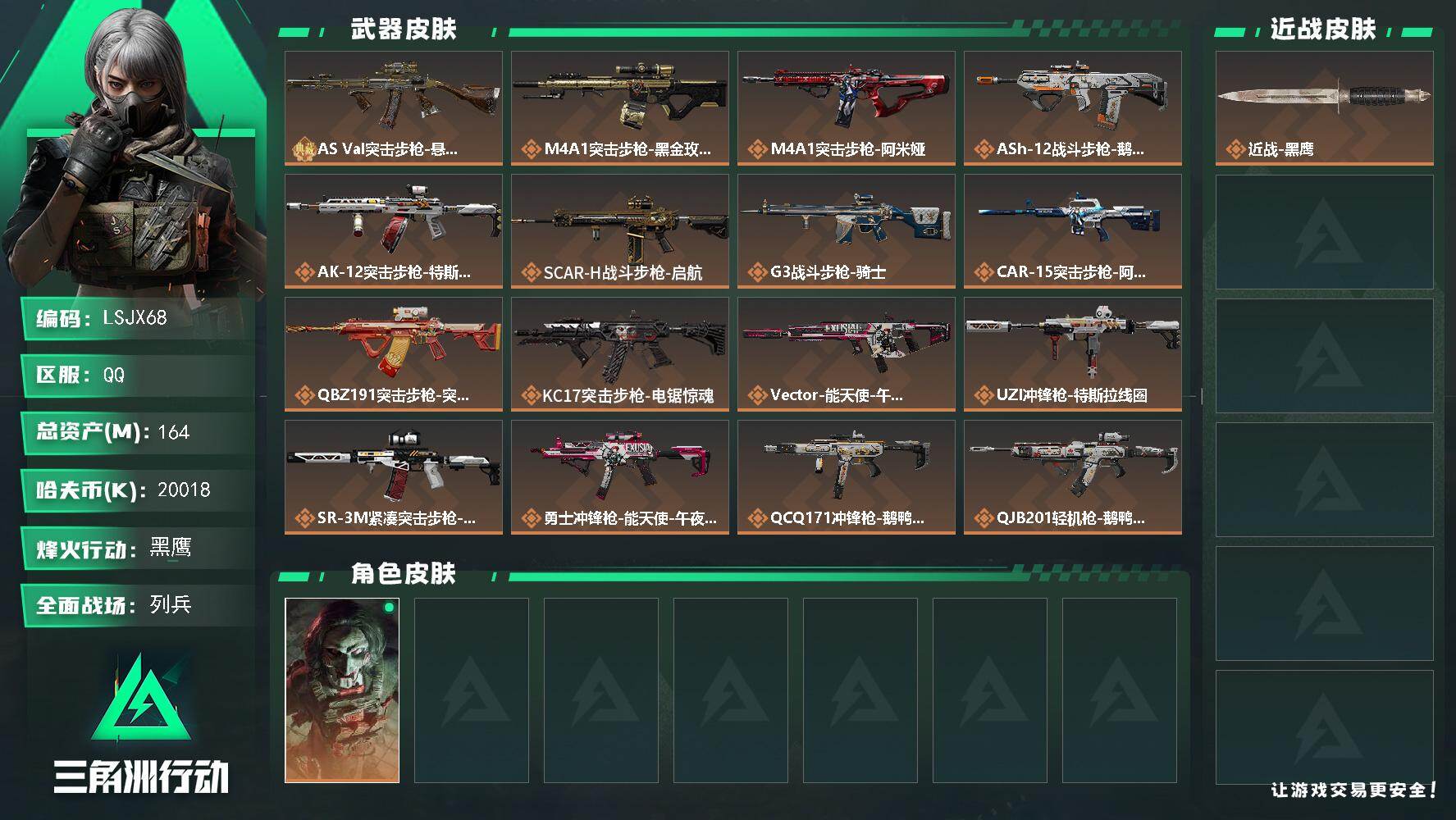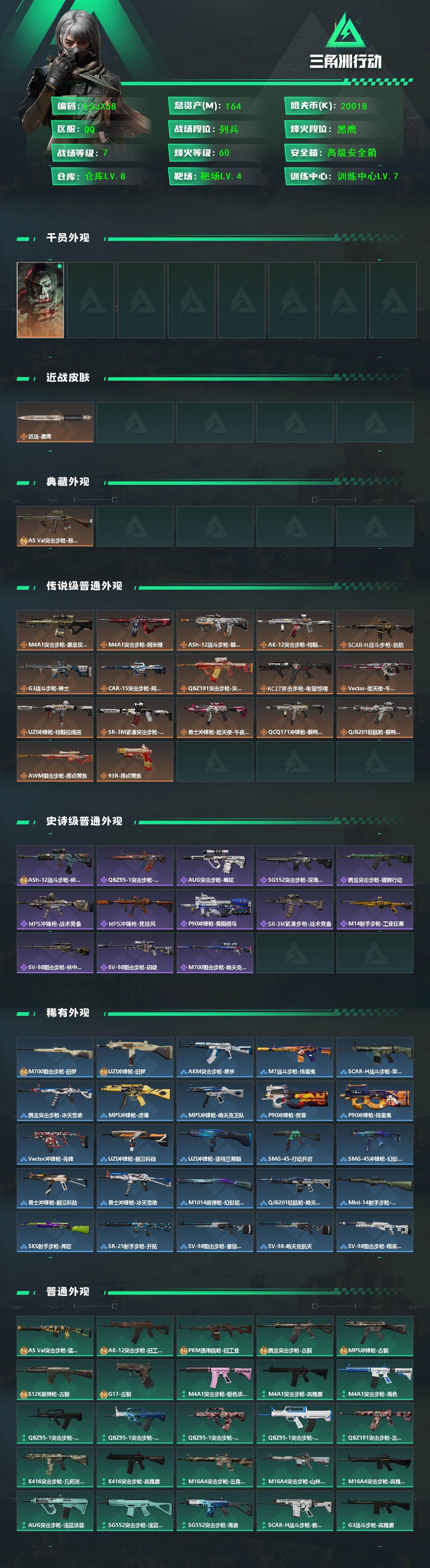 [16045819]1典藏/多子弹/164m总资产-20018k哈伏币-60烽火等级-黑鹰-7战场等级-列兵 【干员外观】:红狼-电锯惊魂 【近战皮肤】:近战-黑鹰 【典藏外观】:AS Val突击步枪-悬赏令 【传说外观】:M4A1突击步枪-蚀金玫瑰,M4A1突击步枪-阿米娅,ASh-12战斗步枪-鹅鸭杀,AK-12突击步枪-特斯拉线圈,SCAR-H战斗步枪-启航,G3战斗步枪-骑士,CAR-15突击步枪-阿米娅,腾龙突击步枪-捞点薯条,KC17突击步枪-电锯惊魂,Vector冲锋枪-能天使-午夜邮差,UZI冲锋枪-特斯拉线圈,SR-3M紧凑突击步枪-特斯拉线圈,勇士冲锋枪-能天使-午夜邮差,QCQ171冲锋枪-鹅鸭杀,QJB201轻机枪-鹅鸭杀,AWM狙击步枪-捞点薯条,93R-捞点薯条 【史诗外观】:ASh-12战斗步枪-碎冰行动,QBZ95-1突击步枪-曙光,AUG突击步枪-蝮蛇,SG552突击步枪-深海恐惧,腾龙突击步枪-猎鳄行动,MP5冲锋枪-战术竞备,MP5冲锋枪-竞技风,P90冲锋枪-莫斯提马,SR-3M紧凑突击步枪-战术竞备,M14射手步枪-工业狂潮,SV-98狙击步枪-林中猎手,SV-98狙击步枪-囚徒,M700狙击步枪-哈夫克警备 【稀有外观】:M700狙击步枪-旧梦,UZI冲锋枪-旧梦,AKM突击步枪-肃杀,M7战斗步枪-捣蛋鬼,SCAR-H战斗步枪-荣耀列队,腾龙突击步枪-冰天雪地,MP5冲锋枪-虎啸,MP5冲锋枪-哈夫克卫队,P90冲锋枪-黄昏,P90冲锋枪-捣蛋鬼,Vector冲锋枪-先锋,UZI冲锋枪-前沿科技,UZI冲锋枪-亚特兰蒂斯,SMG-45-行动开启,SMG-45冲锋枪-幻影结构,勇士冲锋枪-前沿科技,勇士冲锋枪-冰天雪地,M1014霰弹枪-幻影结构,QJB201轻机枪-哈夫克卫队,Mini-14射手步枪-荣耀列队,SKS射手步枪-弄臣,SR-25射手步枪-开拓,SV-98狙击步枪-星链科技,SV-98狙击步枪-哈夫克航天,SV-98狙击步枪-精英联盟 【普通外观】:AS Val突击步枪-猛兽,AK-12突击步枪-旧工业,PKM通用机枪-旧工业,腾龙突击步枪-古铜,MP5冲锋枪-古铜,S12K霰弹枪-古铜,G17-古铜,M4A1突击步枪-粉色涂装,M4A1突击步枪-高雅黑,M4A1突击步枪-海色,QBZ95-1突击步枪-高雅黑,QBZ95-1突