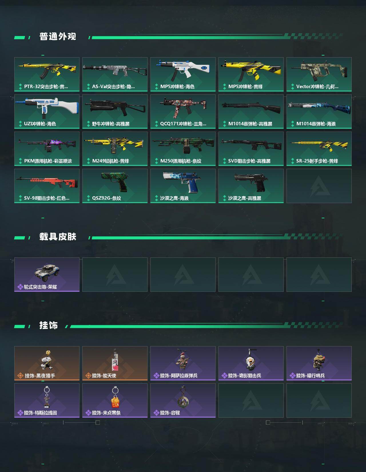 【普通外观】:AS Val突击步枪-猛兽,AK-12突击步枪-旧工业,PKM通用机枪-旧工业,腾龙突击步枪-古铜,MP5冲锋枪-古铜,S12K霰弹枪-古铜,G17-古铜,M4A1突击步枪-粉色涂装,M4A1突击步枪-高雅黑,M4A1突击步枪-海色,QBZ95-1突击步枪-高雅黑,QBZ95-1突