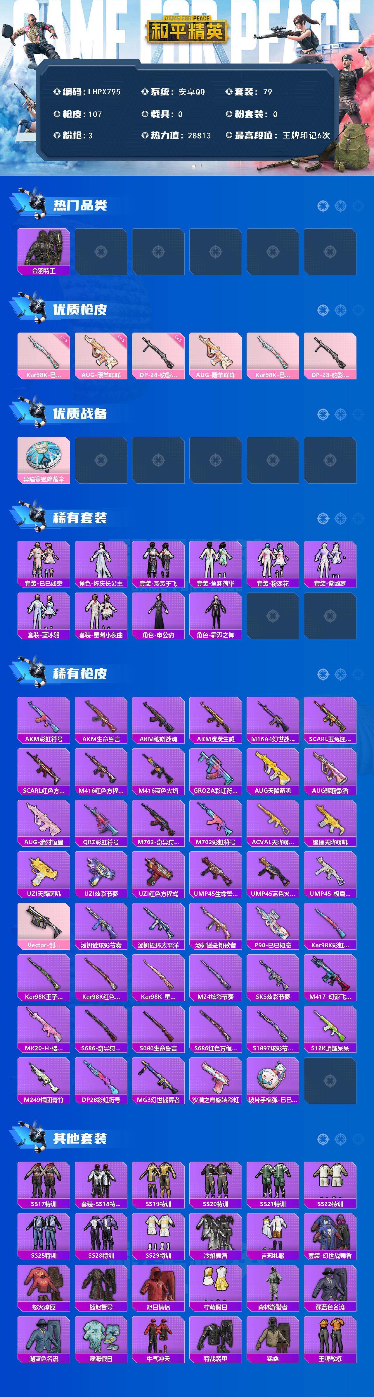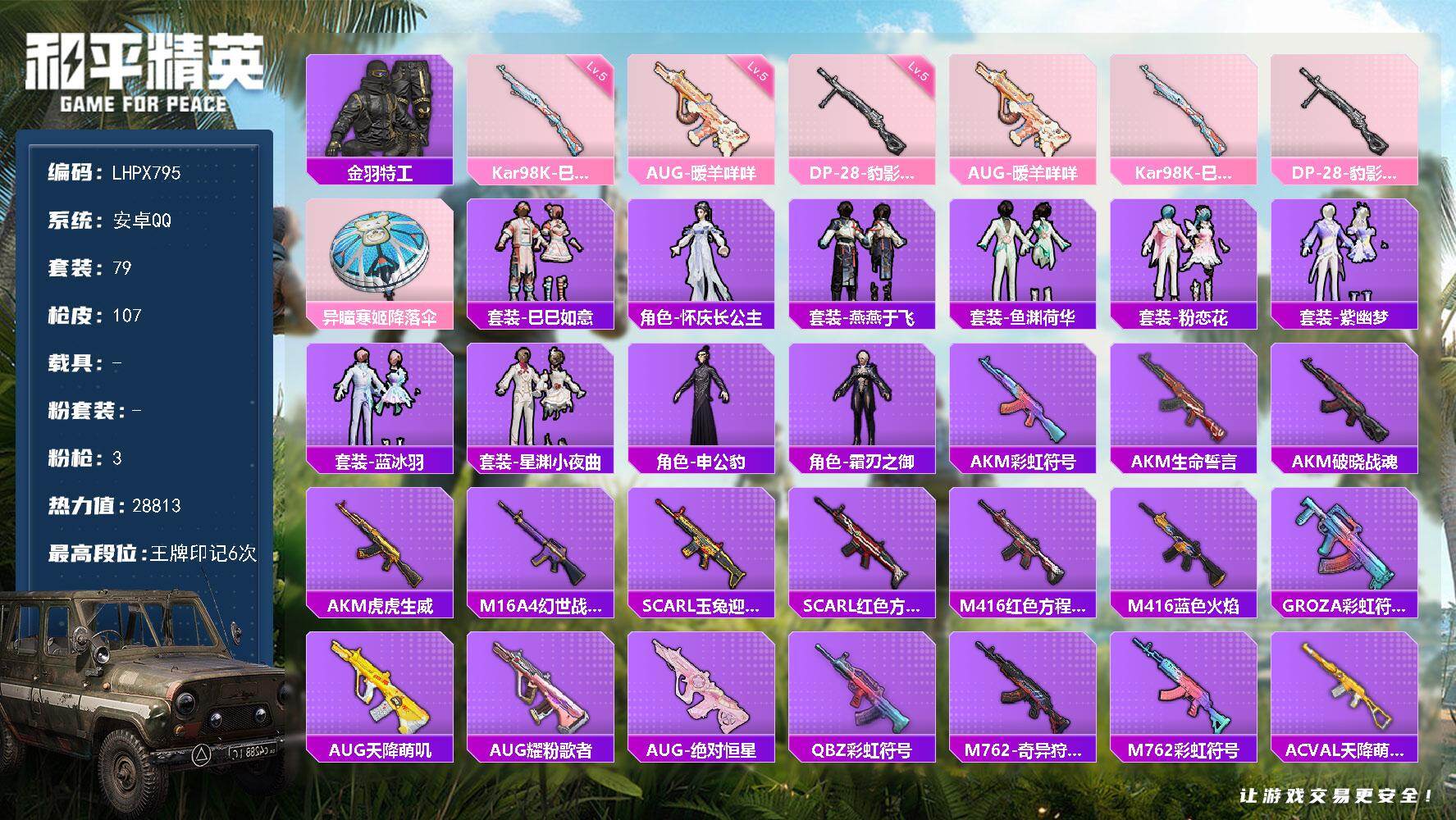 [16045832]【特价出售/店主推荐】安卓 手Q-0粉装-3特效枪-0载具-1粉色飞行器-28813热力值-6王牌印记-79套装-107枪皮 【热门品类】:套装-金羽特工 【粉色枪皮等级】:AUG-暖羊咩咩(五级),Kar98K-巳巳如意(五级),DP-28-豹影疾电(五级) 【粉色枪皮】:AUG-暖羊咩咩,Kar98K-巳巳如意,DP-28-豹影疾电 【粉色降落伞】:异瞳寒姬降落伞,炫彩糖果降落伞 【稀有套装】:套装-巳巳如意,套装-雪国风尚,套装-炫彩糖果,角色-怀庆长公主,套装-燕燕于飞,套装-鱼渊荷华,套装-粉恋花,套装-紫幽梦,套装-蓝冰羽,套装-星渊小夜曲,角色-申公豹,角色-霜刃之御 【稀有枪皮】:AUG-冰晶雪宝,AKM-彩虹符号,AKM-生命誓言,AKM-破晓战魂,AKM-虎虎生威,M16A4-幻世战舞者,SCAR-L-玉兔迎春,SCAR-L-红色方程式,M416-红色方程式,M416-蓝色火焰,GROZA-彩虹符号,AUG-天降萌叽,AUG-耀粉歌者,AUG-绝对恒星,QBZ-彩虹符号,M762-奇异狩猎者,M762-彩虹符号,AC-VAL-天降萌叽,蜜獾-天降萌叽,UZI-天降萌叽,UZI-炫彩节奏,UZI-红色方程式,UMP45-生命誓言,UMP45-蓝色火焰,UMP45-极意拳锋,Vector-创世·救赎,汤姆逊-炫彩节奏,汤姆逊-环太平洋,汤姆逊-耀粉歌者,P90-巳巳如意,Kar98K-彩虹符号,Kar98K-王子的夏天,Kar98K-红色方程式,Kar98K-星穹咏叹调,M24-炫彩节奏,SKS-炫彩节奏,M417-幻影飞狐,MK20-H-樱桃泡泡,S686-奇异狩猎者,S686-生命誓言,S686-红色方程式,S1897-炫彩节奏,S12K-玩趣呆呆,M249-糯团青竹,DP-28-彩虹符号,MG3-幻世战舞者,沙漠之鹰-旋转彩虹,破片手榴弹-巳巳如意 【其他套装】:套装-SS17特训,套装-SS18特训,套装-SS19特训,套装-SS20特训,套装-SS21特训,套装-SS22特训,套装-SS25特训,套装-SS28特训,套装-SS29特训,套装-冷焰舞者,套装-吉莉礼服,套装-幻世战舞者,套装-怒火燎原,套装-战地督导,套装-旭日情侣,套装-柠萌假日,套装-森林游猎者,套装-深蓝色名流,套装-湖蓝色名流,套装-滨海假日,套装-牛气冲天,套装-