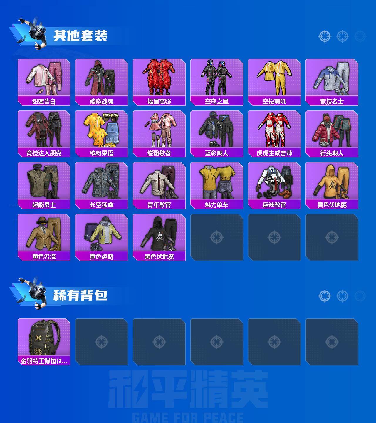 【其他套装】:套装-SS17特训,套装-SS18特训,套装-SS19特训,套装-SS20特训,套装-SS21特训,套装-SS22特训,套装-SS25特训,套装-SS28特训,套装-SS29特训,套装-冷焰舞者,套装-吉莉礼服,套装-幻世战舞者,套装-怒火燎原,套装-战地督导,套装-旭日情侣,套装-柠萌假日,套装-森林游猎者,套装-深蓝色名流,套装-湖蓝色名流,套装-滨海假日,套装-牛气冲天,套装-