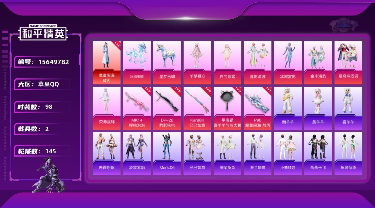 [15649782]【店主推荐捡漏号!可直接换绑】苹果 手Q-1神装-8粉装-5特效枪-2载具-4粉色飞行器-50752热力值-10王牌印记-98套装-145枪皮【红色神装等级】:魔童闹海-敖丙(二级)【红色角色神装】:魔童闹海-敖丙【热门品类】:角色-Mark.06【粉色套装】:角色-白勺歌姬,粉装-莲影清波,角色-冰域雷影,粉装-金丰海韵,粉装-星穹咏叹调,角色-荧海星豚,角色-羊梦糖心【粉色枪皮等级】:P90-魔童闹海 敖丙(一级),Kar98K-巳巳如意(五级),Mk14-樱桃泡泡(七级),DP-28-豹影疾电(五级),平底锅-喜羊羊与灰太狼(三级)【粉色载具】:星梦玉骢,冰绡玉鳞【粉色枪皮】:P90-魔童闹海 敖丙,Kar98K-巳巳如意,Mk14-樱桃泡泡,DP-28-豹影疾电,平底锅-喜羊羊与灰太狼【粉色飞行器】:龙翔九天飞行器,飞天猪飞行器,灵珠游龙飞行器