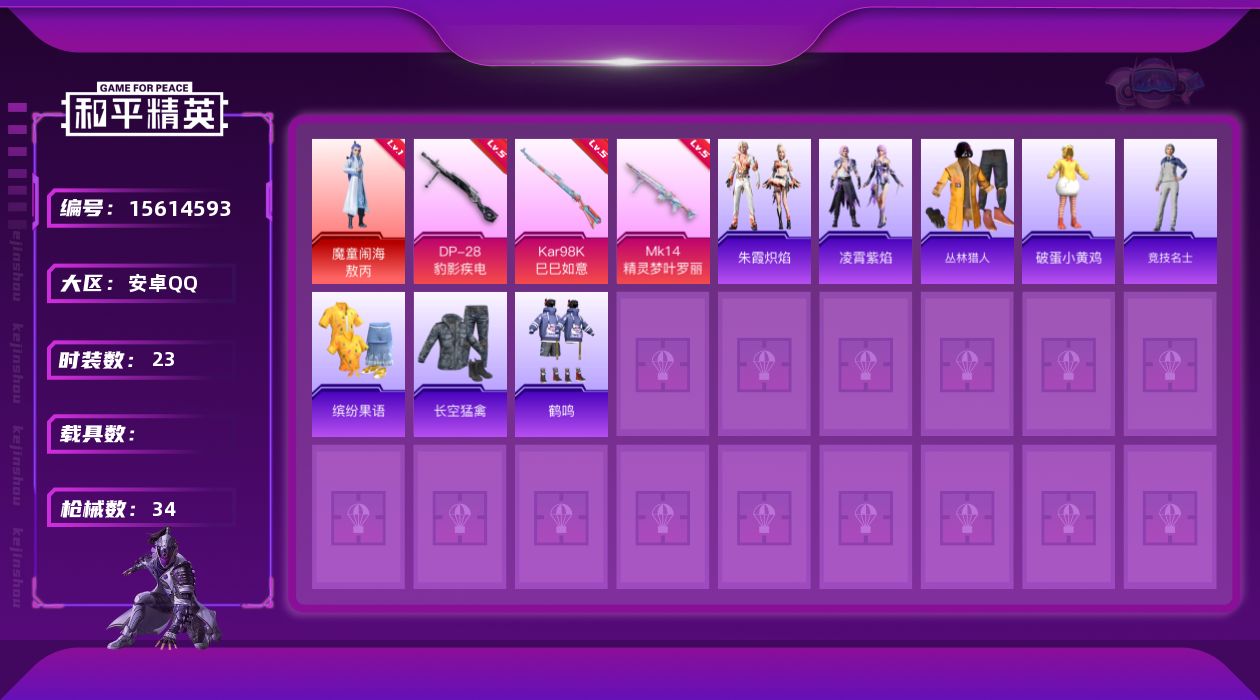 - PX_2061943- 安卓手Q-6王牌印记-4粉装-5特效枪-0载具-29429热力值-65套装-89枪皮-5卓越印记-3传奇印记 【4粉装】,天龙座 紫龙,天鹅座 冰河,萨利娅,玄冥寒域 【5特效枪】M416-电玩时刻-5级 GROZA-镜光银凌-5级 M762-青锋波束-5级 Kar98K-巳巳如意-5级 P90-金丰海韵-7级 【65稀有时装】,SS31特训,SS33特训,SS32特训,