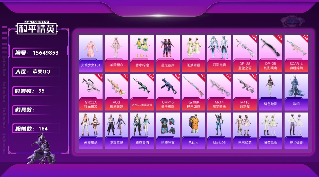[15649853]老101【店主推荐捡漏号!可直接换绑】苹果 手Q-5粉装-10特效枪-0载具-0粉色飞行器-51602热力值-10王牌印记-95套装-164枪皮【热门品类】:套装-火箭少女101,套装-龟仙人,角色-Mark.06【粉色套装】:粉装-香水柠檬,粉装-星之彼岸,粉装-闲梦青缨,粉装-幻彩电音,角色-羊梦糖心【粉色枪皮等级】:SCAR-L-锦绣绵绵(五级),M416-超新星(三级),GROZA-镜光银凌(五级),AUG-暖羊咩咩(五级),M762-青锋波束(五级),UMP45-量子极限(五级),Kar98K-巳巳如意(五级),Mk14-甜梦熊击(五级),DP-28-圣堂之誓(六级),DP-28-豹影疾电(五级)【粉色枪皮】:SCAR-L-锦绣绵绵,M416-超新星,GROZA-镜光银凌,AUG-暖羊咩咩,M762-青锋波束,UMP45-量子极限,Kar98K-巳巳如意,Mk14-甜梦熊击,DP-28-圣堂之誓,DP-28-豹影疾电