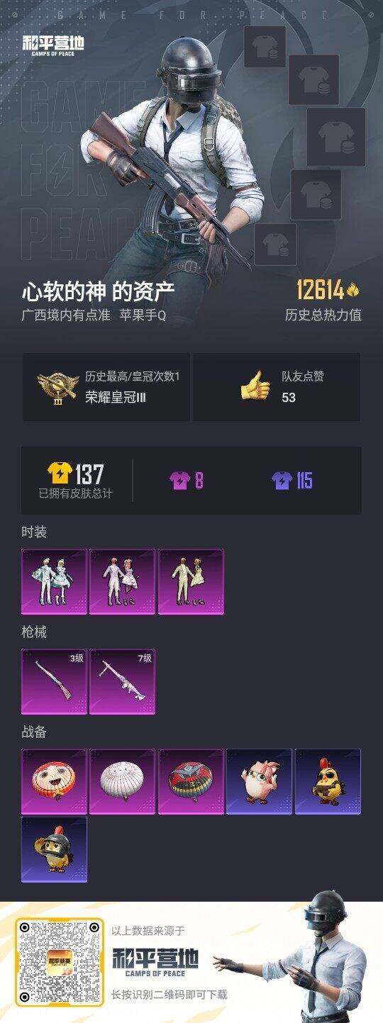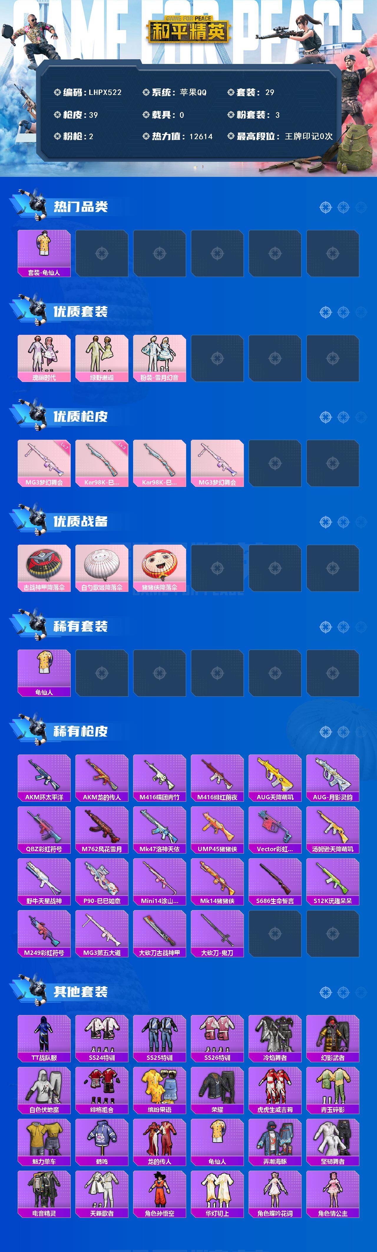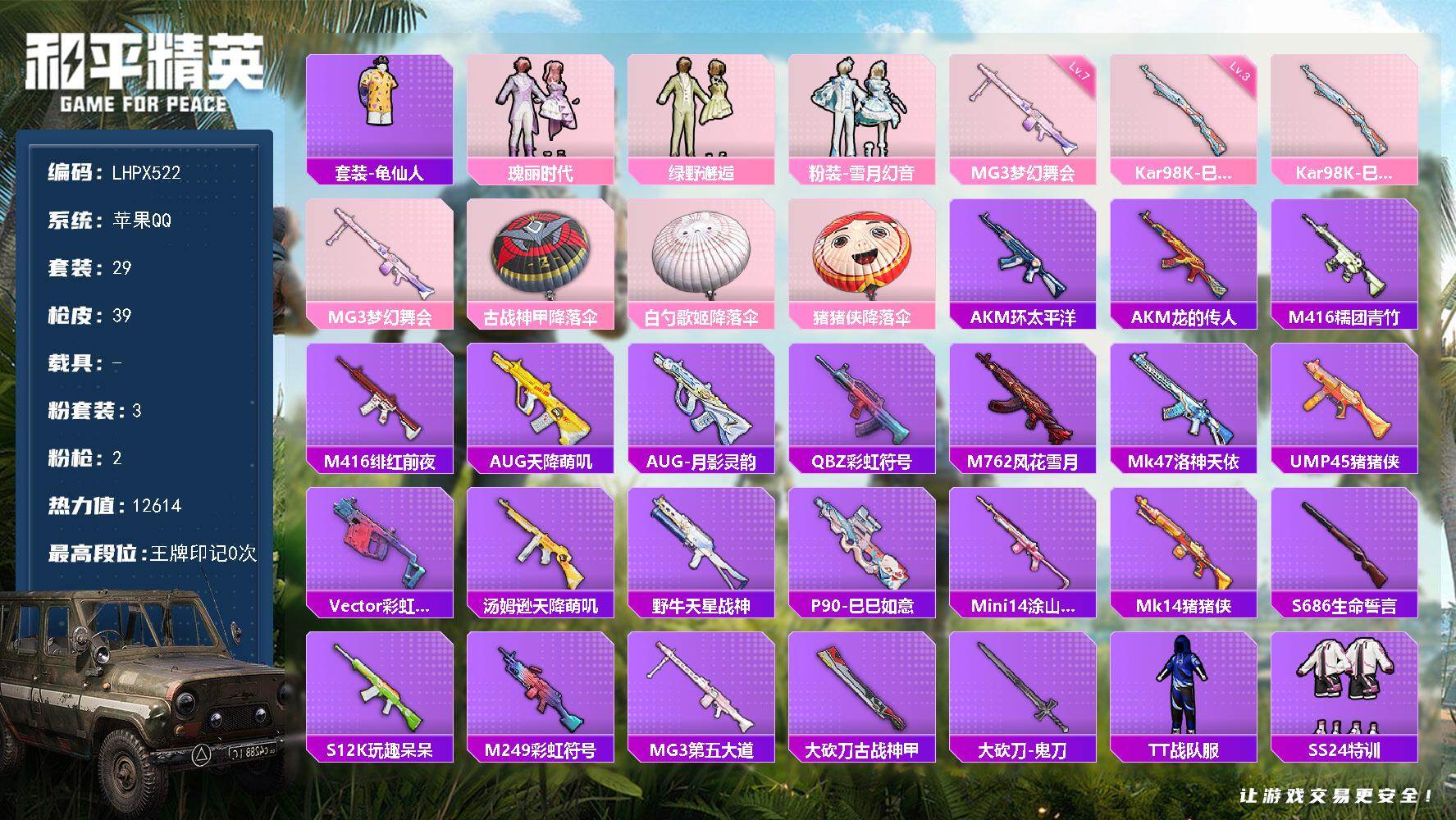 [16028191]【店主推荐捡漏号!可直接换绑】苹果 手Q-3粉装-2特效枪-0载具-0粉色飞行器-12614热力值-1王牌印记-29套装-39枪皮【热门品类】:套装-龟仙人【粉色套装】:粉装-瑰丽时代,粉装-绿野邂逅,粉装-雪月幻音【粉色枪皮等级】:Kar98K-巳巳如意(三级),MG3-梦幻舞会(七级)【粉色枪皮】:Kar98K-巳巳如意,MG3-梦幻舞会
