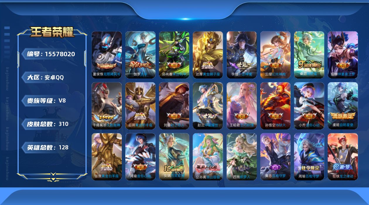 [15578020]【特价出售/店主推荐】安卓Q-V8-至尊星耀V段位-128英雄-310皮肤-1典藏皮肤-1典藏英雄-18传说-87史诗
