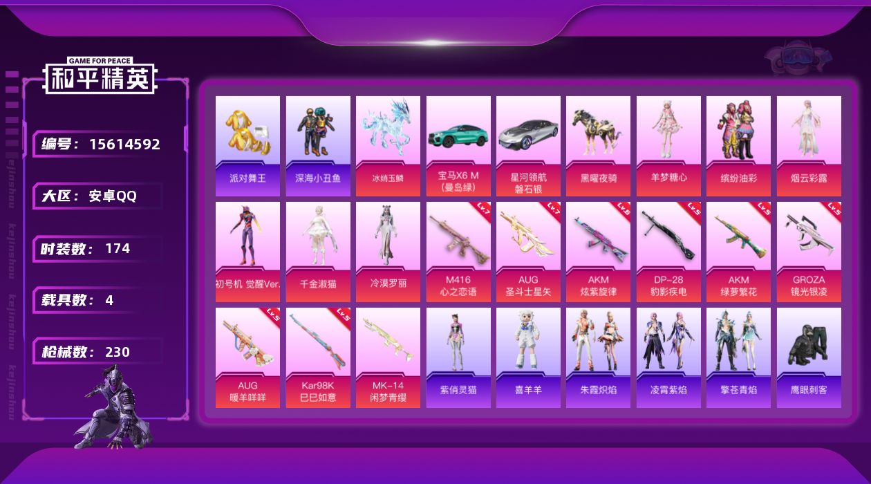 [15614592]【特价出售/店主推荐】安卓 手Q-6粉装-9特效枪-4载具-6粉色飞行器-7.8w热力值-10王牌印记-174套装-230枪皮 【热门品类】:粉装-缤纷油彩,套装-浪漫天命,套装-派对舞王,套装-深海小丑鱼,套装-AG战队服,套装-龟仙人,套装-暗影哥特,套装-粉红小猪,角色-8号机,角色-Mark.06 【粉色套装】:粉装-缤纷油彩,角色-烟云彩露,角色-初号机 觉醒Ver.,角色-千金淑猫,角色-冷漠罗丽,角色-羊梦糖心 【粉色枪皮等级】:AKM-炫紫旋律(六级),AKM-绿萝繁花(五级),M416-心之恋语(七级),GROZA-镜光银凌(五级),AUG-暖羊咩咩(五级),AUG-圣斗士星矢(七级),Kar98K-巳巳如意(五级),DP-28-豹影疾电(五级) 【粉色载具】:宝马X6 M(曼岛绿),星河领航(磐石银),黑曜夜骑,冰绡玉鳞 【粉色枪皮】:AKM-炫紫旋律,AKM-绿萝繁花,M416-心之恋语,GROZA-镜光银凌,AUG-暖羊咩咩,AUG-圣斗士星矢,Kar98K-巳巳如意,Mk14-闲梦青缨,DP-28-豹影疾电 【粉色飞行器】:天之羽翼飞行器,鎏金朋克飞行器,圣域金龙飞行器,灵猫魔法师飞行器,灵珠游龙飞行器 【粉色降落伞】:梦幻火箭降落伞,天之羽翼降落伞,碧影闪光降落伞,环太平洋降落伞,歌者泠鸢降落伞,闲梦青缨降落伞,鎏金朋克降落伞,江南烟雨降落伞,精灵梦叶罗丽降落伞,创世·救赎降落伞,初号机 觉醒Ver.降落伞,忍者神龟降落伞,临安公主降落伞,智耀战神降落伞,星穹咏叹调降落伞,双重狂想降落伞,灵猫魔法师降落伞,绯穹魔姬降落伞,无垠阁降落伞,异瞳寒姬降落伞,炫彩糖果降落伞 【稀有套装】:套装-龟仙人,套装-巳巳如意,套装-雏菊兔兔,套装-萝兰蝴蝶,套装-小熊娃娃,角色-达芬奇,套装-糖糖葫芦,套装-青团波波,套装-棉花软糖,角色-俏兔智灵,套装-燕燕于飞,套装-鱼渊荷华,角色-蜜桃派对,套装-粉恋花,套装-紫幽梦,套装-蓝冰羽,角色-猎影月神,套装-星渊小夜曲,套装-彩虹兔,套装-云朵鹅,套装-雪绒豹,套装-蜜露汐语,套装-极光猎影,套装-朱霞炽焰,套装-凌霄紫焰,套装-擎苍青焰,玩偶服-喜羊羊,角色-紫俏灵猫,套装-炫彩糖果 【稀有枪皮】:AUG-冰晶雪宝,AKM-夜灯,AKM-彩虹符号,AKM-生命誓言,AKM-破晓战魂,AKM-龙的传人