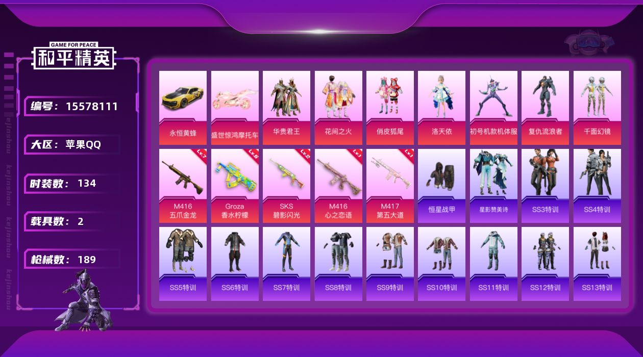 [15578111]【店主推荐捡漏号!可直接换绑】苹果 手Q-7粉装-5特效枪-2载具-4粉色飞行器-61344热力值-5王牌印记-134套装-189枪皮 【粉色套装】:粉装-华贵君王,粉装-花间之火,粉装-俏皮狐尾,角色-洛天依,角色-初号机款机体服,角色-复仇流浪者,粉装-千面幻镜 【粉色枪皮等级】:M416-五爪金龙(七级),M416-心之恋语(一级),GROZA-香水柠檬(六级),SKS-碧影闪光(二级),M417-第五大道(一级) 【粉色载具】:永恒黄蜂,盛世惊鸿摩托车 【粉色枪皮】:M416-五爪金龙,M416-心之恋语,GROZA-香水柠檬,SKS-碧影闪光,M417-第五大道 【粉色飞行器】:千面幻镜飞行器,璀璨巨星飞行器,凤舞九天飞行器 【粉色降落伞】:炫紫旋律降落伞,神秘黑猫降落伞,四圣焕新降落伞,花间之火降落伞,激战未来降落伞,银刃赛罗降落伞,机甲封神降落伞,洛神天依降落伞,绿意幻情降落伞,恐龙拽拽降落伞,千面幻镜降落伞,青空秋雨降落伞,盛世惊鸿降落伞 【稀有套装】:套装-星影赞美诗 【稀有枪皮】:AKM-冰凉西瓜,AKM-墨染幽兰,AKM-天启纪元,AKM-彩虹符号,AKM-星之彼岸,AKM-生命誓言,AKM-筑梦精灵,AKM-萌趣颜团子,AKM-锦绣火鲤,M16A4-幻世战舞者,M16A4-甜心亚梦,M16A4-生命誓言,SCAR-L-玉兔迎春,SCAR-L-红色方程式,M416-夜灯,M416-神秘黑猫,M416-红色方程式,M416-绯红前夜,M416-葫芦兄弟,M416-蓝色火焰,GROZA-2B战斗服款,GROZA-异彩先驱,GROZA-春暖花开,GROZA-治愈之星,GROZA-田园牧歌,GROZA-紫翼圣骑,GROZA-黑色刀锋,AUG-天降萌叽,AUG-魔法学院,QBZ-原初圣火,QBZ-彩虹符号,QBZ-洛神天依,QBZ-璀璨巨星,QBZ-神秘黑猫,QBZ-飞驰魅影,M762-彩虹甜喵,M762-快乐主宰,M762-拳皇97,M762-牛气冲天,Mk47-妙红点点,G36C-不夜海上花,G36C-暗夜玫瑰,G36C-花间之火,AC-VAL-天降萌叽,AC-VAL-甜心亚梦,蜜獾-千面幻镜,蜜獾-垂柳戏鸭,蜜獾-娇憨猪猪,UZI-众神之王,UZI-娇憨猪猪,UZI-幻影战神,UZI-炫彩节奏,UZI-金风玉露,UZI-盛世惊鸿,UMP45-天启