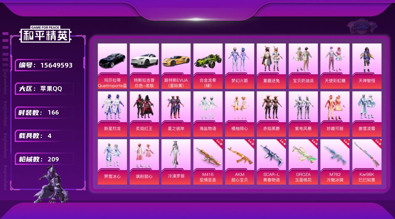 [15649593]【店主推荐捡漏号!可直接换绑】苹果 手Q-17粉装-9特效枪-4载具-1僚机-1粉色飞行器-76495热力值-9王牌印记-166套装-209枪皮【热门品类】:粉装-梦幻火箭,粉装-童趣迷兔,套装-小丑鱼,角色-2P战斗服款,套装-龟仙人,套装-粉红小猪【粉色套装】:粉装-宝贝奶油派,粉装-天使彩虹糖,粉装-梦幻火箭,粉装-天禅智恒,粉装-新星烈龙,粉装-童趣迷兔,粉装-炙焰红王,粉装-星之彼岸,粉装-海盐物语,粉装-橘柚倾心,粉装-赤焰黑爵,粉装-紫电风暴,粉装-妙趣可丽,粉装-傲雪凌霜,粉装-霁雪冰心,粉装-飒粉甜心,角色-冷漠罗丽【粉色枪皮等级】:AKM-甜心宝贝(五级),AKM-星际浪客(一级),SCAR-L-青春物语(四级),M416-心之恋语(一级),M416-至情至圣(九级),GROZA-玉面桃花(四级),M762-冷魅冰骑(四级),UMP45-恐龙拽拽(二级),Kar98K-巳巳如意(四级)【粉色载具】:特斯拉Model X(珍珠白),路特斯EVIJA(星际黄),玛莎拉蒂Quattroporte(夜幕蓝),合金龙骨(绿),僚机-萌兔起飞【粉色枪皮】:AKM-甜心宝贝,AKM-星际浪客,SCAR-L-青春物语,M416-心之恋语,M416-至情至圣,GROZA-玉面桃花,M762-冷魅冰骑,UMP45-恐龙拽拽,Kar98K-巳巳如意【粉色飞行器】:庄周梦蝶飞行器