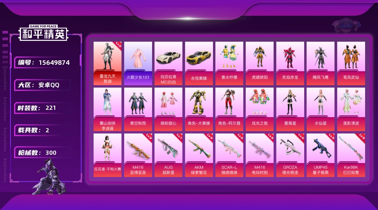 [15649874]老101【店主推荐捡漏号!可直接换绑】安卓 手Q-1神装-15粉装-10特效枪-2载具-11粉色飞行器-105735热力值-15王牌印记-221套装-300枪皮【红色神装等级】:墨龙九天-敖渊(二级)【红色角色神装】:墨龙九天-敖渊【热门品类】:套装-火箭少女101,套装-龟仙人,套装-暗影哥特,套装-粉红小猪【粉色套装】:粉装-香水柠檬,粉装-虎啸骄阳,粉装-炙焰赤龙,粉装-飓风飞鹰,粉装-鸾凤武仙,蜀山剑侠-李逍遥,粉装-青空秋雨,粉装-飒粉甜心,角色-大黄蜂,角色-阿尔茜,粉装-炫光之旅,角色-蔷薇星,角色-水仙星,粉装-莲影清波,角色-狂花道·不知火舞粉色枪皮等级】:AKM-绿萝繁花(五级),SCAR-L-锦绣绵绵(五级),M416-至情至圣(九级),M416-电玩时刻(五级),GROZA-镜光银凌(五级),AUG-超新星(七级),UMP45-量子极限(五级),Kar98K-巳巳如意(五级),M24-镜域双华(三级),DP-28-豹影疾电(四级)【粉色载具】:玛莎拉蒂MC20(星石白),永恒黄蜂【粉色枪皮】:AKM-绿萝繁花,SCAR-L-锦绣绵绵,M416-至情至圣,M416-电玩时刻,GROZA-镜光银凌,AUG-超新星,UMP45-量子极限,Kar98K-巳巳如意,M24-镜域双华,DP-28-豹影疾电【粉色飞行器】:酣梦熊熊飞行器,庄周梦蝶飞行器,变形金刚飞行器,萌物绒绒飞行器,沙丘之主天马,繁龙极客飞行器,镜域双华-灵镜之阶,龙翔九天飞行器,冠军兔兔飞行器,万象金身飞行器