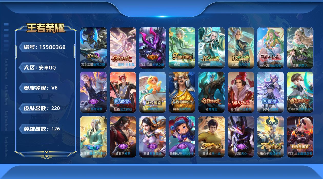 [15580368]安卓Q-V6-最强王者段位-126英雄-220皮肤-4传说-54史诗