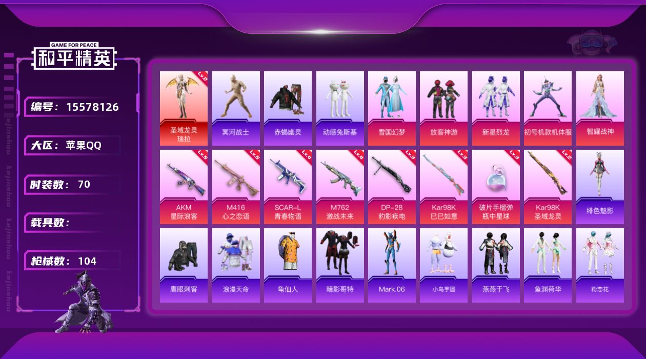[15578126]【店主推荐捡漏号!可直接换绑】苹果 手Q-1神装-5粉装-8特效枪-0载具-1粉色飞行器-34521热力值-2王牌印记-70套装-104枪皮