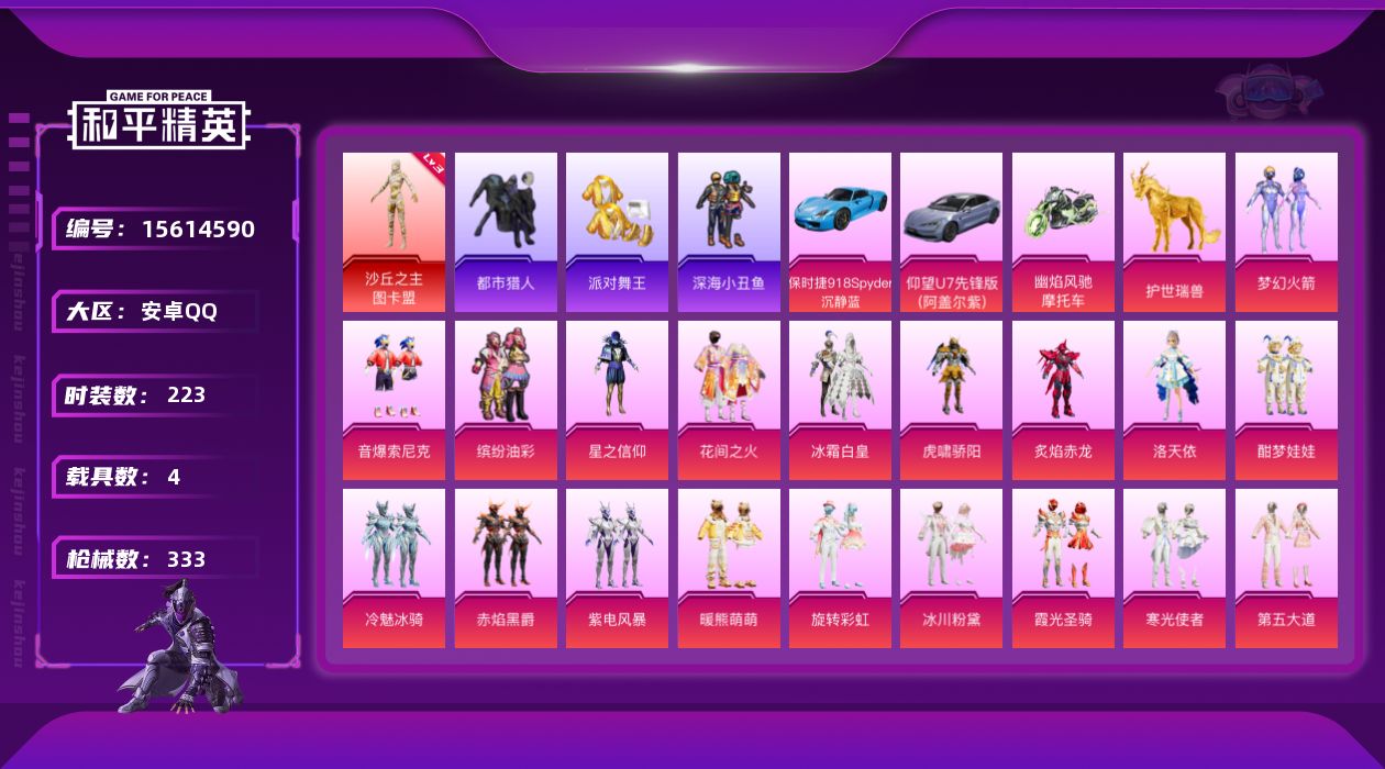 [15614590]【店主推荐捡漏号!可直接换绑】安卓 手Q-1神装-32粉装-21特效枪-4载具-19粉色飞行器-12.7w热力值-10王牌印记-223套装-333枪皮 【红色神装等级】:沙丘之主-图卡盟(三级) 【红色角色神装】:沙丘之主-图卡盟 【热门品类】:粉装-梦幻火箭,粉装-音爆索尼克,粉装-缤纷油彩,套装-浪漫天命,套装-都市猎人,套装-派对舞王,套装-深海小丑鱼,套装-龟仙人,角色-8号机,角色-Mark.06 【粉色套装】:粉装-梦幻火箭,粉装-星之信仰,粉装-缤纷油彩,粉装-花间之火,粉装-冰霜白皇,粉装-虎啸骄阳,粉装-炙焰赤龙,角色-洛天依,粉装-酣梦娃娃,粉装-冷魅冰骑,粉装-赤焰黑爵,粉装-紫电风暴,粉装-暖熊萌萌,粉装-旋转彩虹,粉装-冰川粉黛,粉装-霞光圣骑,粉装-寒光使者,粉装-音爆索尼克,粉装-第五大道,超级赛亚人-孙悟空,角色-呆萌星弥,角色-猩猩队长,粉装-闲梦青缨,角色-宙之时溯,粉装-蜜语绒猫,角色-严莉莉,角色-小蓝,角色-初号机 觉醒Ver.,角色-千金淑猫,角色-智耀战神,角色-凤凰座 一辉,角色-冷漠罗丽 【粉色枪皮等级】:AKM-魔法神域(三级),AKM-幽焰骑士(三级),SCAR-L-锦绣绵绵(五级),SCAR-L-魔童闹海 哪吒(三级),M416-全功率超战(五级),M416-墨龙九天(六级),GROZA-精灵之光(三级),AUG-暖羊咩咩(五级),Famas-初号机 觉醒Ver.(五级),AKS-74U-星穹咏叹调(二级),Kar98K-创世·救赎(四级),Kar98K-巳巳如意(五级),M24-莲影清波(四级),M24-镜域双华(三级),Mk14-精灵梦叶罗丽(三级),AMR-智耀战神(五级),M417-第五大道(五级),MK12-雪月幻音(一级),DP-28-豹影疾电(五级),MG3-洛神天依(二级),MG-36-沧焰双生(五级) 【粉色载具】:仰望U7(阿盖尔紫),保时捷918 Spyder(沉静蓝),幽焰风驰摩托车,僚机-冰龙团团,护世瑞兽 【粉色枪皮】:AKM-魔法神域,AKM-幽焰骑士,SCAR-L-锦绣绵绵,SCAR-L-魔童闹海 哪吒,M416-全功率超战,M416-墨龙九天,GROZA-精灵之光,AUG-暖羊咩咩,Famas-初号机 觉醒Ver.,AKS-74U-星穹咏叹调,Kar98K-创世·救赎,Kar
