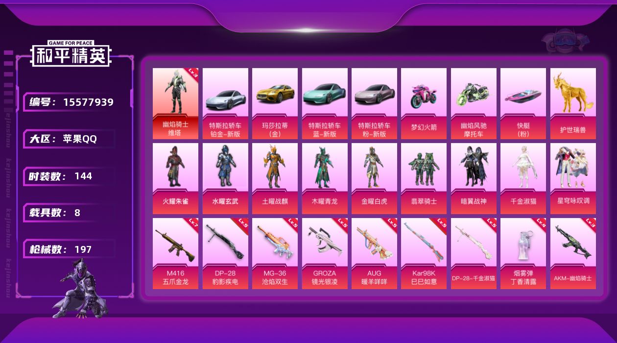 [15577939]【特价出售/店主推荐】苹果 手Q-1神装-9粉装-12特效枪-8载具-1僚机 -13粉色飞行器-82787热力值-4王牌印记-144套装-197枪皮【红色神装等级】:幽焰骑士-维塔(三级)【红色角色神装】:幽焰骑士-维塔【热门品类】:套装-龟仙人【粉色套装】:粉装-火曜朱雀,粉装-水曜玄武,粉装-土曜战麒,粉装-木曜青龙,粉装-金曜白虎,粉装-翡翠骑士,粉装-暗翼战神,角色-千金淑猫,粉装-星穹咏叹调【粉色枪皮等级】:AKM-幽焰骑士(三级),SCAR-L-金蛇镇世(三级),M416-五爪金龙(七级),GROZA-镜光银凌(五级),AUG-暖羊咩咩(五级),P90-沙丘之主(三级),Kar98K-巳巳如意(五级),Mk14-盛世惊鸿(三级),DP-28-千金淑猫(五级),DP-28-豹影疾电(五级),MG-36-沧焰双生(五级),烟雾弹-丁香清露(四级)【粉色载具】:特斯拉Roadster(水滴蓝),特斯拉Roadster(沁心粉),特斯拉Roadster(尊享铂),玛莎拉蒂Ghibli(金),双人摩托-梦幻火箭,幽焰风驰摩托车,空客H135-蔚蓝之翼,快艇-塞莎KL27(霓虹粉),护世瑞兽【粉色枪皮】:AKM-幽焰骑士,SCAR-L-金蛇镇世,M416-五爪金龙,GROZA-镜光银凌,AUG-暖羊咩咩,P90-沙丘之主,Kar98K-巳巳如意,Mk14-盛世惊鸿,DP-28-千金淑猫,DP-28-豹影疾电,MG-36-沧焰双生,烟雾弹-丁香清露【粉色飞行器】:酣梦熊熊飞行器,梦幻火箭飞行器,激战未来飞行器,沙丘之主天马,镜域双华-灵镜之阶,龙翔九天飞行器,幽焰列车飞行器,凤舞九天飞行器,万象金身飞行器,绯果甜心飞行器,灵猫魔法师飞行器