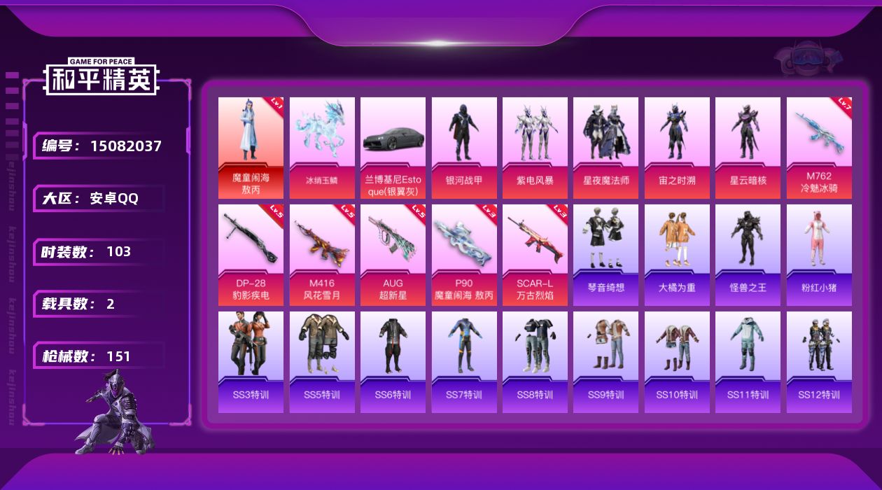 [15082037]【特价出售/店主推荐最性价比】安卓 手Q-1神装-5粉装-6特效枪-2载具-2粉色飞行器-49669热力值-17王牌印记-103套装-151枪皮 【红色神装等级】:魔童闹海-敖丙(一级) 【红色角色神装】:魔童闹海-敖丙 【热门品类】:绝对防御上衣,套装-粉红小猪 【粉色套装】:粉装-银河战甲,粉装-紫电风暴,粉装-星夜魔法师,角色-宙之时溯,角色-星云暗核 【粉色枪皮等级】:SCAR-L-万古烈焰(三级),M416-风花雪月(五级),AUG-超新星(五级),M762-冷魅冰骑(七级),P90-魔童闹海 敖丙(三级),DP-28-豹影疾电(五级) 【粉色载具】:兰博基尼Estoque(银翼灰),冰绡玉鳞 【粉色枪皮】:SCAR-L-万古烈焰,M416-风花雪月,AUG-超新星,M762-冷魅冰骑,P90-魔童闹海 敖丙,DP-28-豹影疾电 【粉色飞行器】:星夜魔法师飞行翼,灵珠游龙飞行器 【粉色降落伞】:绿意幻情降落伞,恐龙拽拽降落伞,炙焰牛王降落伞,万古烈焰降落伞,魔童闹海 敖丙降落伞 【稀有套装】:套装-琴音绮想 【稀有枪皮】:AKM-夜灯,AKM-彩虹符号,AKM-灼热熔岩,AKM-破晓战魂,AKM-虎虎生威,AKM-霓虹街区,M16A4-幻世战舞者,M16A4-机械英豪,M16A4-甜心亚梦,M16A4-红色方程式,M16A4-蓝色火焰,SCAR-L-怪兽之王,SCAR-L-炫彩节奏,SCAR-L-红色方程式,M416-夜灯,M416-神秘黑猫,M416-蓝色火焰,GROZA-2B战斗服款,GROZA-异彩先驱,GROZA-懵萌河马,AUG-天降萌叽,AUG-耀粉歌者,QBZ-原初圣火,QBZ-彩虹符号,QBZ-飞驰魅影,M762-牛气冲天,G36C-不夜海上花,G36C-冷魅冰骑,G36C-懵萌河马,AC-VAL-甜心亚梦,蜜獾-天降萌叽,ACE32-画境星梦,UZI-众神之王,UZI-炫彩节奏,UMP45-夜灯,UMP45-怪兽之王,UMP45-生命誓言,Vector-彩虹符号,Vector-生命誓言,Vector-香水柠檬,汤姆逊-勇闯险境,汤姆逊-天降萌叽,汤姆逊-异彩先驱,野牛-机械英豪,MP5K-众神之王,MP5K-异彩先驱,P90-飞驰魅影,Kar98K-勇闯险境,Kar98K-红色方程式,Kar98K-飞驰魅影,M24-炫彩节奏,M24-