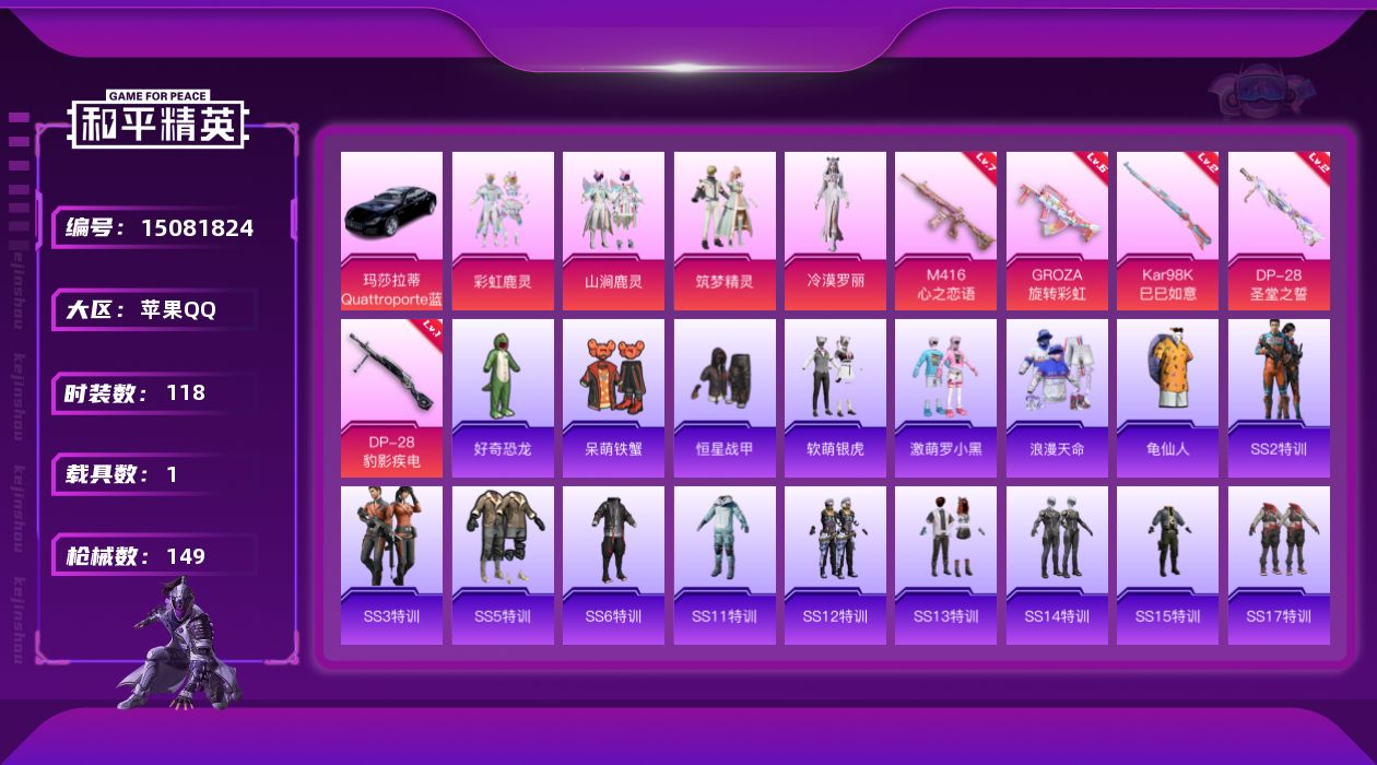 [15081824]【特价出售/店主推荐】苹果 手Q-4粉装-5特效枪-1载具-1粉色飞行器-4.8热力值-4王牌印记-118套装-149枪皮