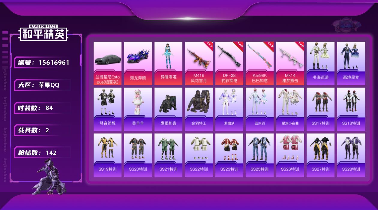 [15616961]【店主推荐捡漏号!可直接换绑】苹果 手Q-1粉装-4特效枪-2载具--4.1w热力值-8王牌印记-84套装-142枪皮 【热门品类】:套装-金羽特工 【粉色套装】:角色-异瞳寒姬 【粉色枪皮等级】:M416-风花雪月(七级),Kar98K-巳巳如意(五级),Mk14-甜梦熊击(五级),DP-28-豹影疾电(五级) 【粉色载具】:兰博基尼Estoque(银翼灰),海龙奔腾 【粉色枪皮】:M416-风花雪月,Kar98K-巳巳如意,Mk14-甜梦熊击,DP-28-豹影疾电 【粉色降落伞】:百万伏特降落伞,橘柚倾心降落伞,旋转彩虹降落伞,炫光之旅降落伞,异瞳寒姬降落伞,极意拳锋降落伞 【稀有套装】:套装-雪国风尚,套装-紫幽梦,套装-蓝冰羽,套装-星渊小夜曲,玩偶服-美羊羊,套装-书海巡游,套装-画境星梦,套装-琴音绮想 【稀有枪皮】:AKM-彩虹符号,AKM-灼热熔岩,AKM-破晓战魂,AKM-虎虎生威,AKM-霓虹街区,M16A4-幻世战舞者,SCAR-L-炫彩节奏,SCAR-L-玉兔迎春,SCAR-L-红色方程式,SCAR-L-黄金龙骨,M416-暗夜行者,M416-糯团青竹,GROZA-异彩先驱,GROZA-影袭,GROZA-田园牧歌,GROZA-紫翼圣骑,AUG-海螺星光,AUG-耀粉歌者,QBZ-彩虹符号,QBZ-飞驰魅影,M762-天降萌叽,M762-彩虹符号,M762-瑞龙福将,M762-绯红前夜,G36C-冷魅冰骑,G36C-星穹咏叹调,AC-VAL-天降萌叽,AC-VAL-彩虹甜喵,蜜獾-天降萌叽,蜜獾-娇憨猪猪,ACE32-画境星梦,UZI-天降萌叽,UZI-娇憨猪猪,UZI-影袭,UZI-炫彩节奏,UMP45-夜灯,Vector-彩虹符号,Vector-暗夜玫瑰,Vector-生命誓言,Vector-田园牧歌,汤姆逊-异彩先驱,MP5K-异彩先驱,MP5K-蓝莓炮弹,MP5K-画境星梦,P90-飞驰魅影,P90-巳巳如意,Kar98K-影袭,Kar98K-飞驰魅影,Kar98K-星穹咏叹调,M24-影袭,SKS-糯团青竹,VSS-彩虹符号,VSS-田园牧歌,Mini14-千面幻镜,Mini14-异彩先驱,Mini14-海渊国主,Mini14-炫彩节奏,Mini14-耀粉歌者,Win94-瑞龙福将,SLR-娇憨猪猪,M1加兰德-画境星梦,S1897