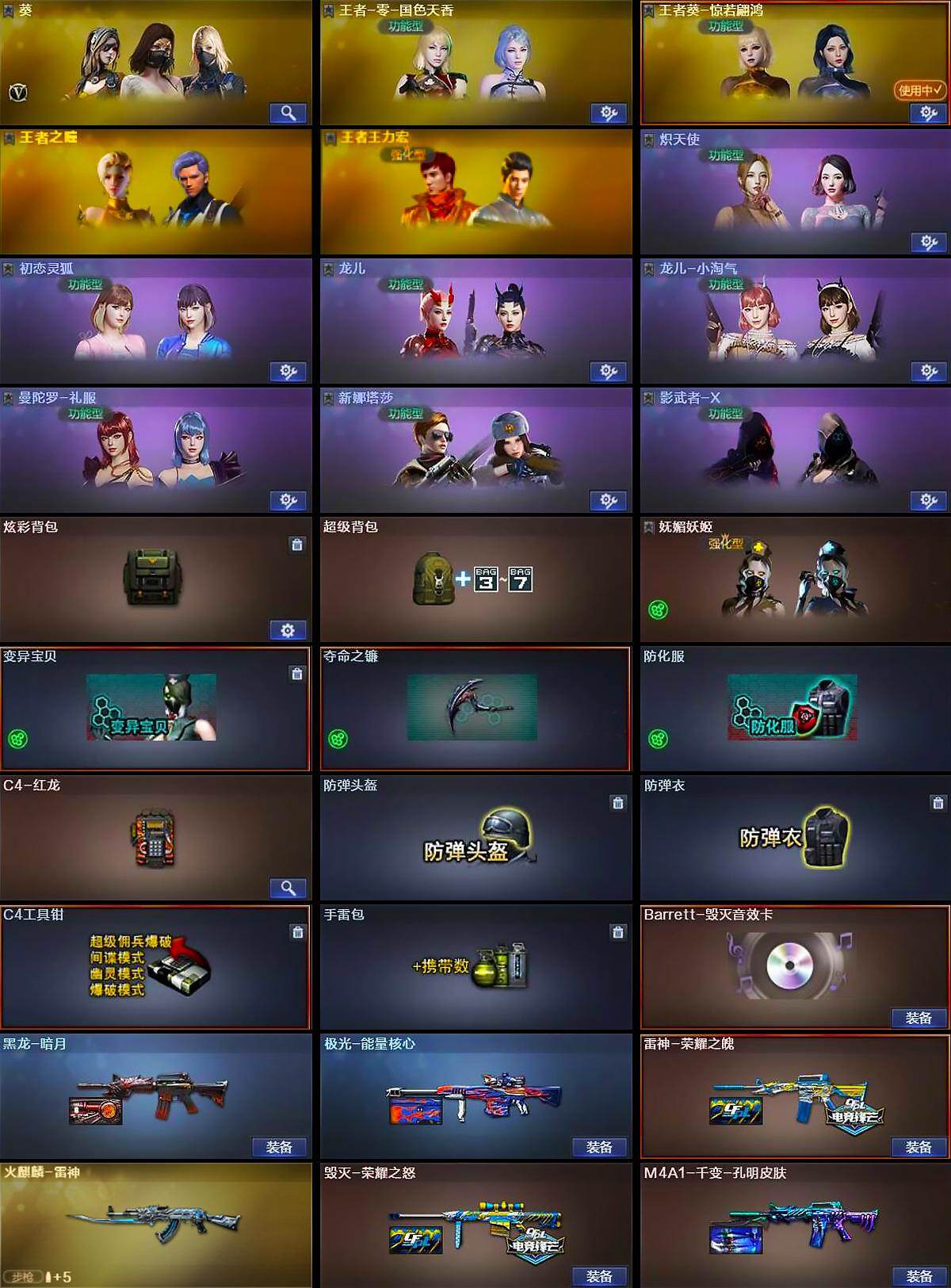 【道具】:炫彩背包,超级背包,妩媚妖姬,变异宝贝,夺命之镰,防化服,C4-红龙,防弹头盔,防弹衣,C4工具钳,手雷包
