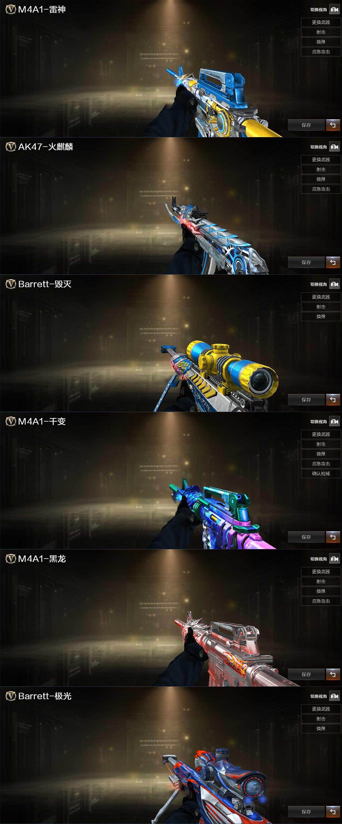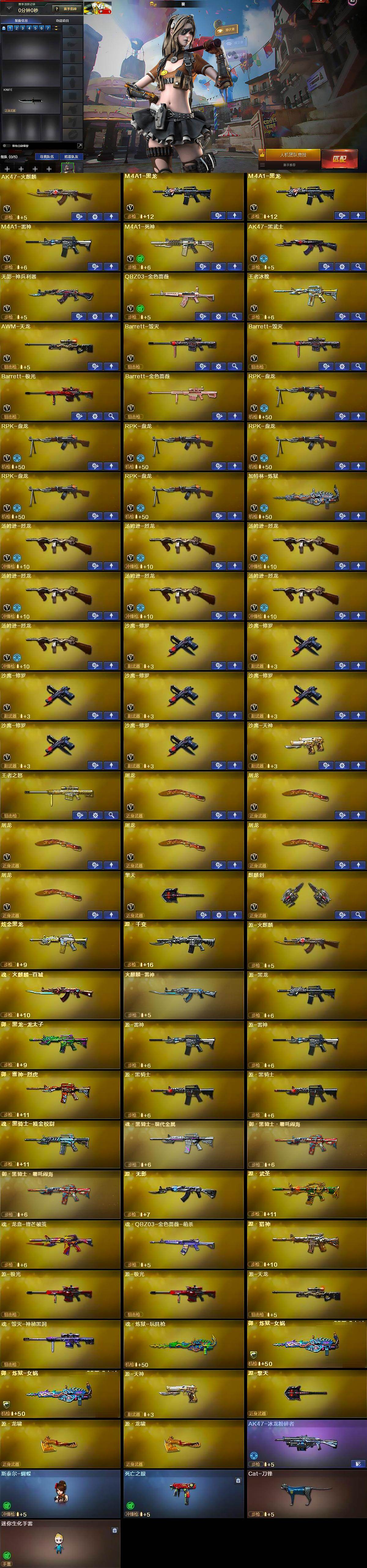【英雄级武器】:AK47-火麒麟,M4A1-黑龙*2,M4A1-雷神,M4A1-死神,AK47-黑武士,无影-神兵利器,QBZ03-金色蔷薇,王者冰魄-觉醒版,AWM-天龙,Barrett-毁灭*2,Barrett-极光,Barrett-金色蔷薇,RPK-盘龙*6,加特林-炼狱,汤姆逊-烈龙*7,沙鹰-修罗*7,沙鹰-天神,屠龙*6,擎天,麒麟刺