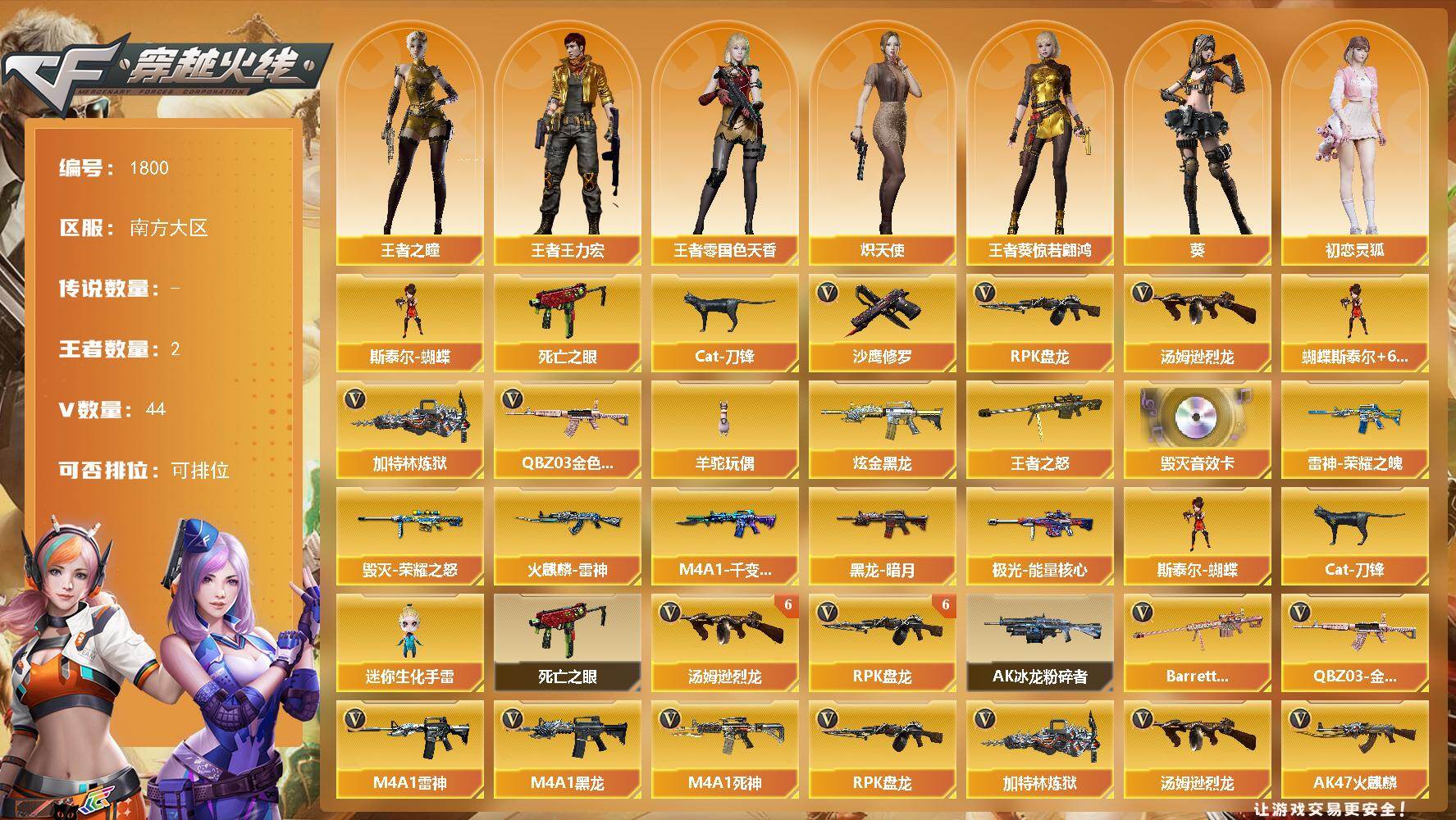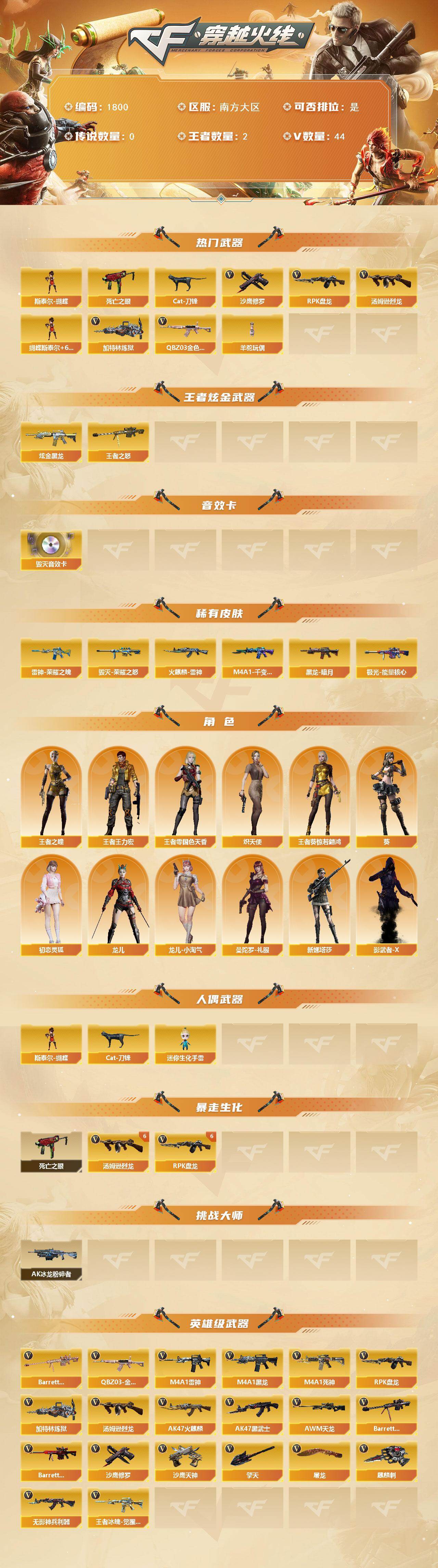 [16049893]南方大区-44V-2王者-1炫金 【热门武器】:QBZ03-金色蔷薇,死亡之眼,Cat-刀锋,汤姆逊-烈龙*7,RPK-盘龙*6,加特林-炼狱,斯泰尔-蝴蝶,羊驼玩偶,沙鹰-修罗*7 【王者炫金武器】:王者之怒,炫金黑龙 【音效卡】:Barrett-毁灭音效卡 【皮肤】:雷神-荣耀之魄,火麒麟-雷神,毁灭-荣耀之怒,M4A1-千变-孔明皮肤,黑龙-暗月,极光-能量核心 【角色】:葵,王者-零-国色天香,王者葵-惊若翩鸿,王者之瞳,王者王力宏,炽天使,初恋灵狐,龙儿,龙儿-小淘气,曼陀罗-礼服,新娜塔莎,影武者-X 【人偶武器】:斯泰尔-蝴蝶,Cat-刀锋,迷你生化手雷 【暴走生化】:死亡之眼 【挑战大师】:AK47-冰龙粉碎者 【英雄级武器】:AK47-火麒麟,M4A1-黑龙*2,M4A1-雷神,M4A1-死神,AK47-黑武士,无影-神兵利器,QBZ03-金色蔷薇,王者冰魄-觉醒版,AWM-天龙,Barrett-毁灭*2,Barrett-极光,Barrett-金色蔷薇,RPK-盘龙*6,加特林-炼狱,汤姆逊-烈龙*7,沙鹰-修罗*7,沙鹰-天神,屠龙*6,擎天,麒麟刺 【道具】:炫彩背包,超级背包,妩媚妖姬,变异宝贝,夺命之镰,防化服,C4-红龙,防弹头盔,防弹衣,C4工具钳,手雷包 【特殊枪械】:蝴蝶斯泰尔+6烈龙,6烈龙,6盘龙,1炼狱,1蝴蝶斯泰尔