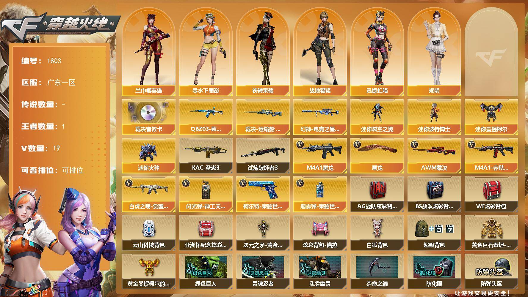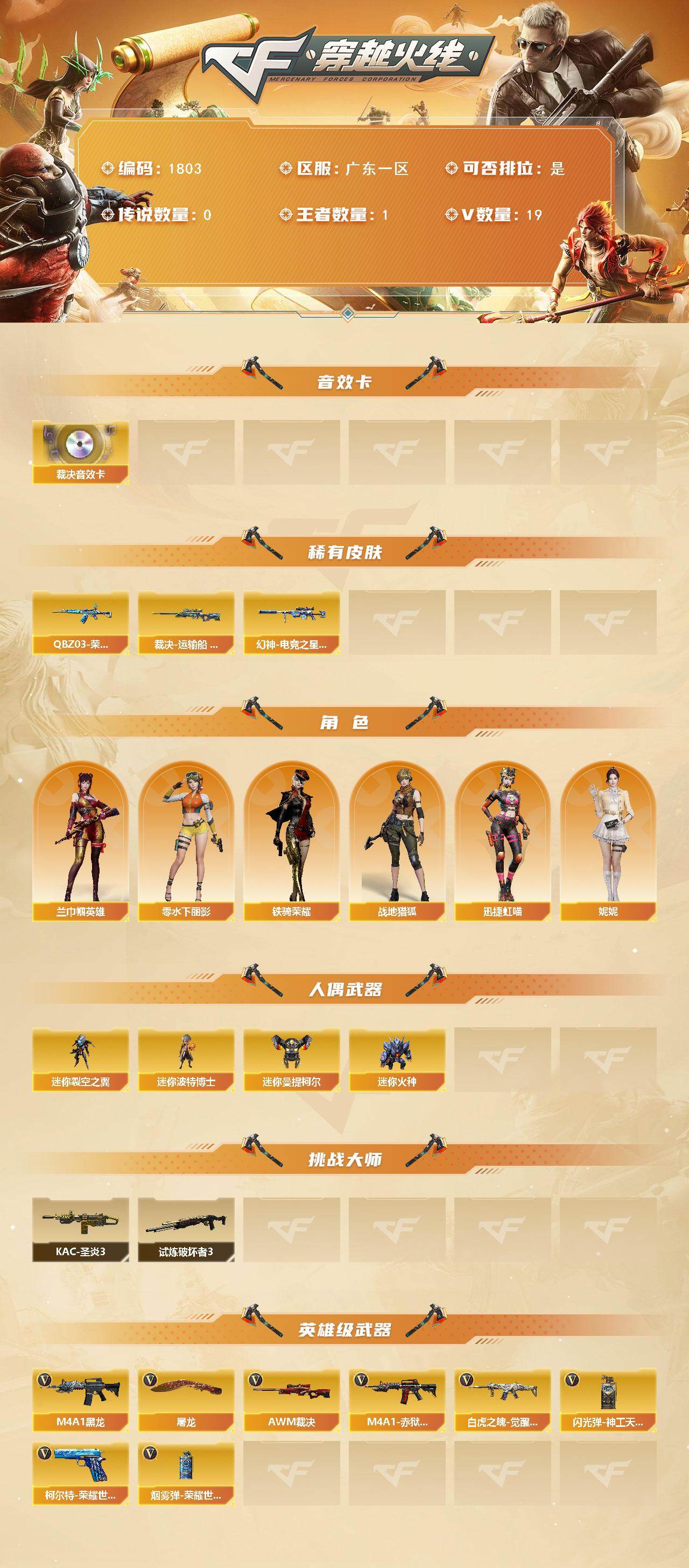[16050258]广东一区-19V-1王者-0炫金 【音效卡】:AWM-裁决音效卡 【皮肤】:幻神-电竞之星 皮肤,QBZ03-荣耀世冠EP 皮肤,裁决-运输船 皮肤 【角色】:兰-巾帼英雄,迅捷虹喵,妮妮,战地猎狐,零-水下丽影,铁骑荣耀 【人偶武器】:迷你裂空之翼*3,迷你波特博士*4,迷你曼提柯尔,迷你火种 【挑战大师】:试炼破坏者III,KAC-圣炎切割者III 【英雄级武器】:M4A1-黑龙,白虎之魄-觉醒版,AWM-裁决,柯尔特-荣耀世冠EP,屠龙,闪光弹-神工天巧,烟雾弹-荣耀世冠EP*5,M4A1-赤狱骑士 【道具】:鲨鲨水溅跃背包,AG战队炫彩背包,BS战队炫彩背包,WE炫彩背包,云山科技背包,亚洲杯纪念炫彩背包,次元之矛-黄金背包,炫彩背包-诺拉,白狐背包,超级背包,黄金巨石泰坦-魔花研究所背包,黄金曼提柯尔的背包,绿色巨人,灵魂忍者,迷雾幽灵,夺命之镰,防化服*3,防弹头盔*3,防弹衣*3,C4工具钳*3,手雷包*3 【特殊枪械】: