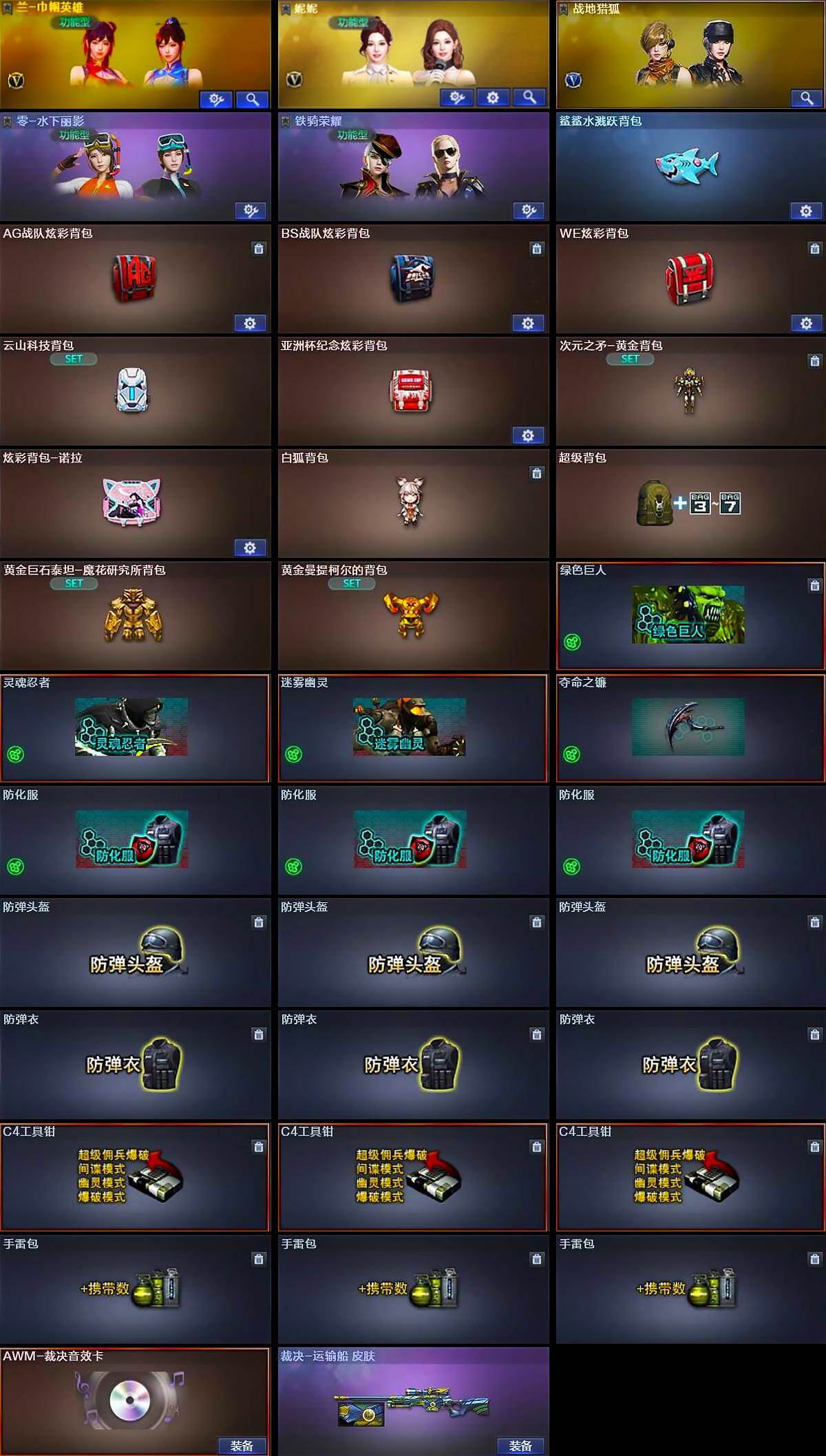 【道具】:鲨鲨水溅跃背包,AG战队炫彩背包,BS战队炫彩背包,WE炫彩背包,云山科技背包,亚洲杯纪念炫彩背包,次元之矛-黄金背包,炫彩背包-诺拉,白狐背包,超级背包,黄金巨石泰坦-魔花研究所背包,黄金曼提柯尔的背包,绿色巨人,灵魂忍者,迷雾幽灵,夺命之镰,防化服*3,防弹头盔*3,防弹衣*3,C4工具钳*3,手雷包*3