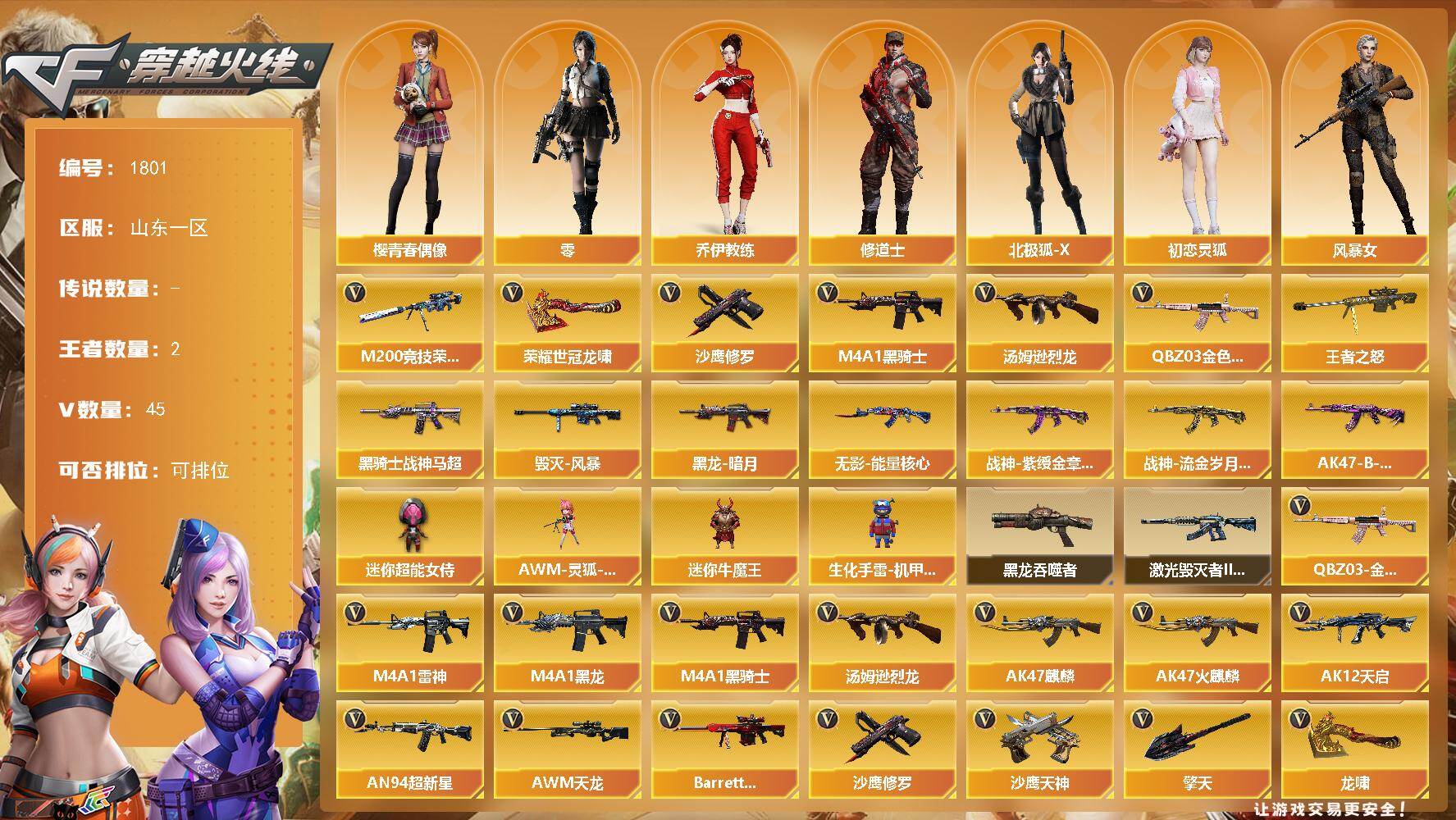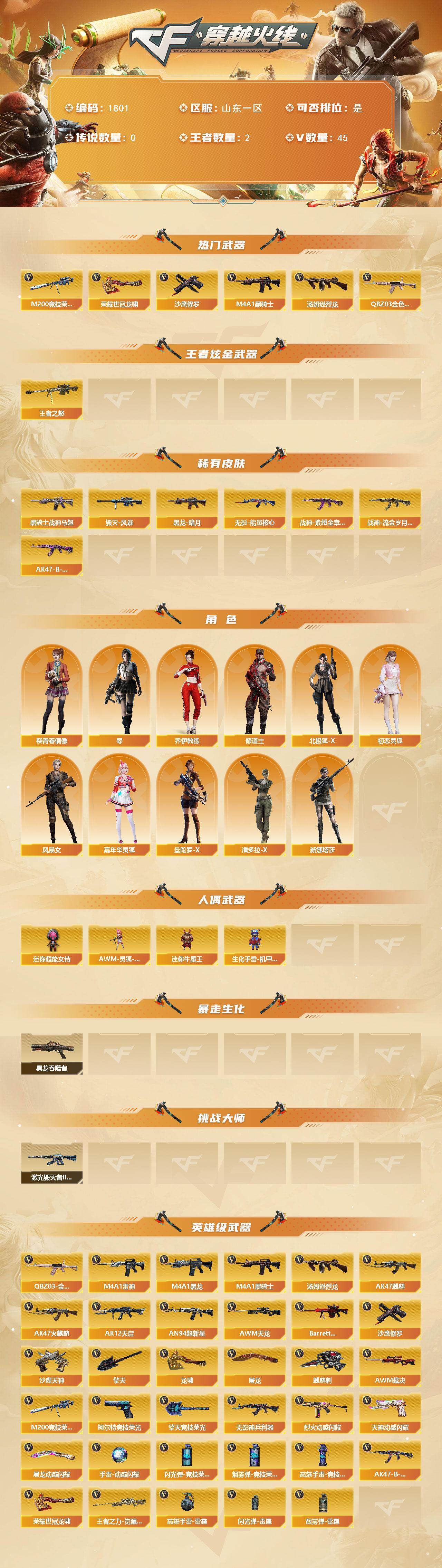 [16050084]山东一区-45V-2王者-0炫金 【热门武器】:QBZ03-金色蔷薇,M200-竞技荣光,M4A1-黑骑士,汤姆逊-烈龙,沙鹰-修罗,荣耀世冠-龙啸 【王者炫金武器】:王者之怒 【皮肤】:毁灭-风暴,黑龙-暗月,黑骑士-战神马超,无影-能量核心,战神-紫绶金章皮肤,战神-流金岁月皮肤,AK47-B-常胜将军-曹操 【角色】:零,乔伊教练,修道士,北极狐-X,初恋灵狐,风暴女,嘉年华灵狐,曼陀罗-X,潘多拉-X,新娜塔莎,樱-青春偶像 【人偶武器】:AWM-灵狐-15周年嘉年华,迷你牛魔王,生化手雷-机甲核心,迷你超能女侍 【暴走生化】:黑龙吞噬者 【挑战大师】:激光毁灭者III-白马银枪 【英雄级武器】:AK47-火麒麟,AK47-麒麟,M4A1-黑龙,M4A1-雷神,M4A1-黑骑士,AK12-天启,AN94-超新星*2,无影-神兵利器,QBZ03-金色蔷薇,烈火-动感闪耀,AK47-B-战神,AWM-天龙,Barrett-极光,AWM-裁决,M200-竞技荣光,王者之力-觉醒版,汤姆逊-烈龙,沙鹰-修罗,沙鹰-天神,柯尔特-竞技荣光,天神-动感闪耀,屠龙,龙啸*2,擎天,麒麟刺,擎天-竞技荣光,屠龙-动感闪耀,荣耀世冠-龙啸,高爆手雷-雷霆*2,高爆手雷-竞技荣光*2,手雷-动感闪耀,闪光弹-雷霆*2,闪光弹-竞技荣光,烟雾弹-雷霆*2,烟雾弹-竞技荣光*2 【道具】:战舰背包,绿色巨人,灵魂忍者,迷雾幽灵,夺命之镰,防化服*2,金色流光-枪王排位*2,星辰流光-枪王排位,枪王排位28赛季金色流光,枪王排位29赛季金色流光,电玩兔兔表情,动感闪耀表情,防弹头盔*3,防弹衣*3,C4工具钳*3,手雷包*4 【特殊枪械】:1黑骑士,1烈龙
