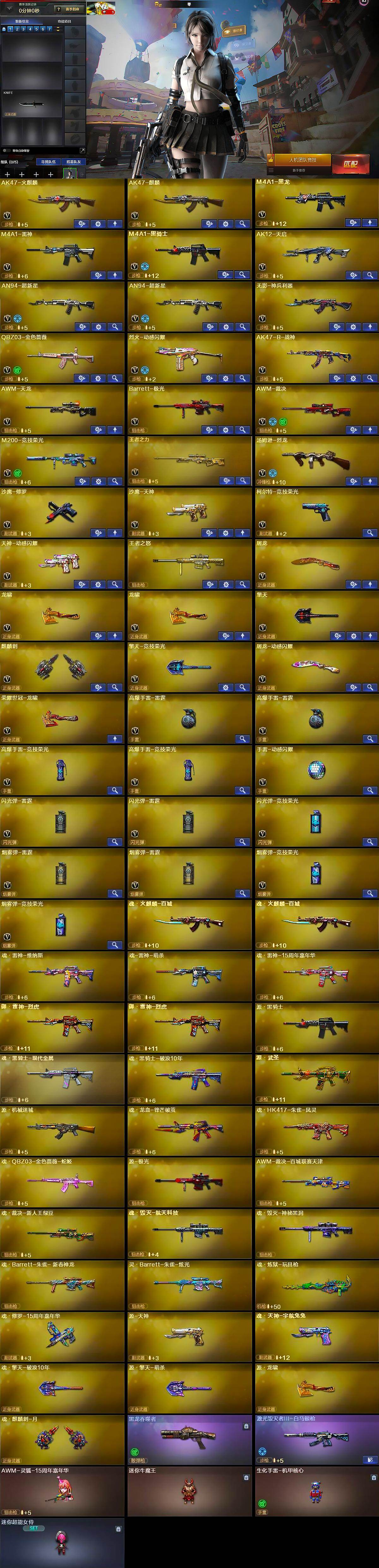 【英雄级武器】:AK47-火麒麟,AK47-麒麟,M4A1-黑龙,M4A1-雷神,M4A1-黑骑士,AK12-天启,AN94-超新星*2,无影-神兵利器,QBZ03-金色蔷薇,烈火-动感闪耀,AK47-B-战神,AWM-天龙,Barrett-极光,AWM-裁决,M200-竞技荣光,王者之力-觉醒版,汤姆逊-烈龙,沙鹰-修罗,沙鹰-天神,柯尔特-竞技荣光,天神-动感闪耀,屠龙,龙啸*2,擎天,麒麟刺,擎天-竞技荣光,屠龙-动感闪耀,荣耀世冠-龙啸,高爆手雷-雷霆*2,高爆手雷-竞技荣光*2,手雷-动感闪耀,闪光弹-雷霆*2,闪光弹-竞技荣光,烟雾弹-雷霆*2,烟雾弹-竞技荣光*2