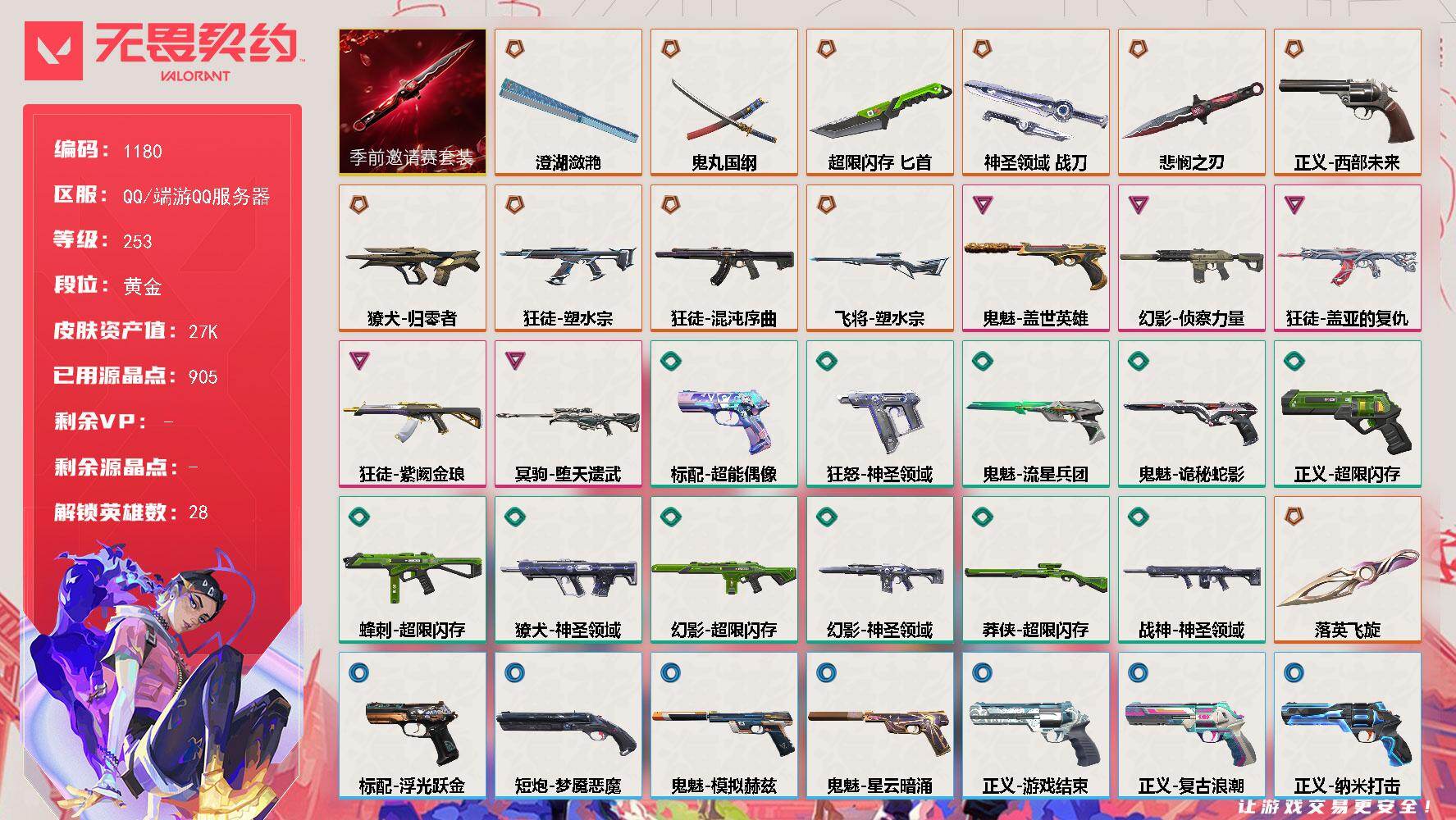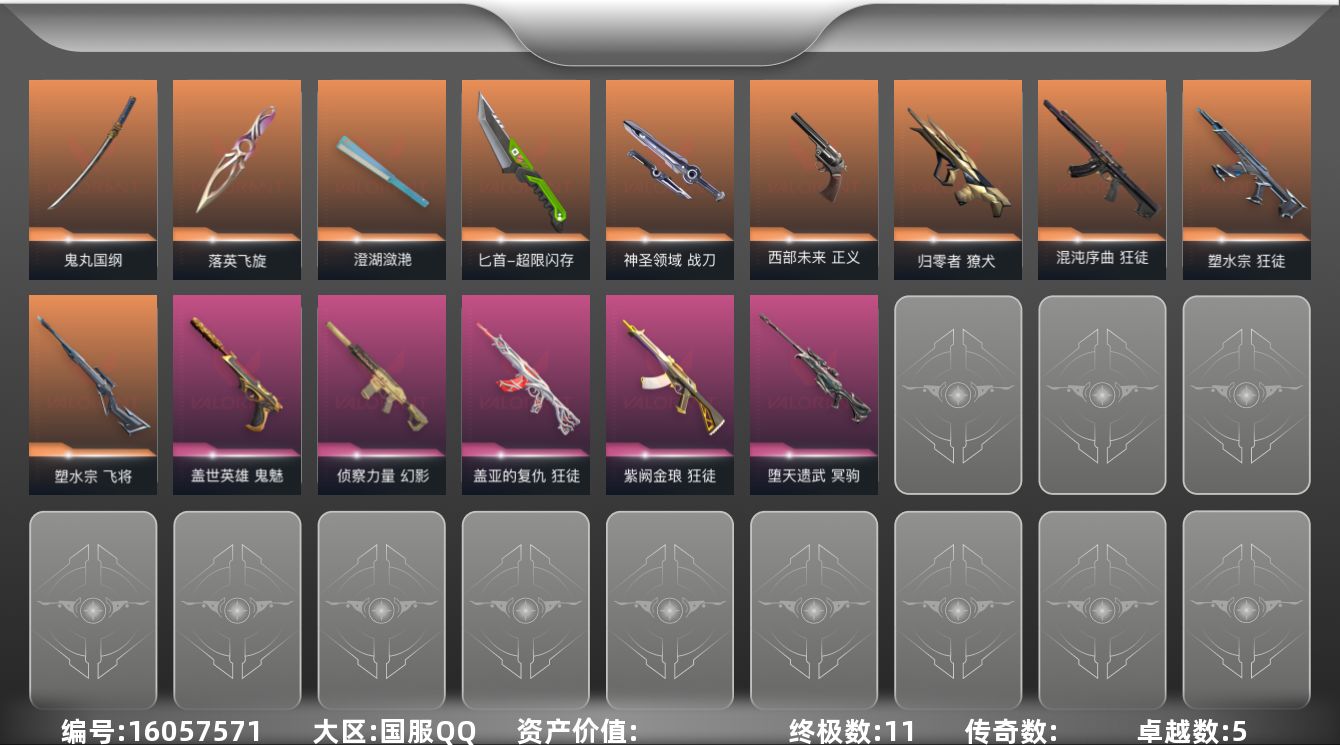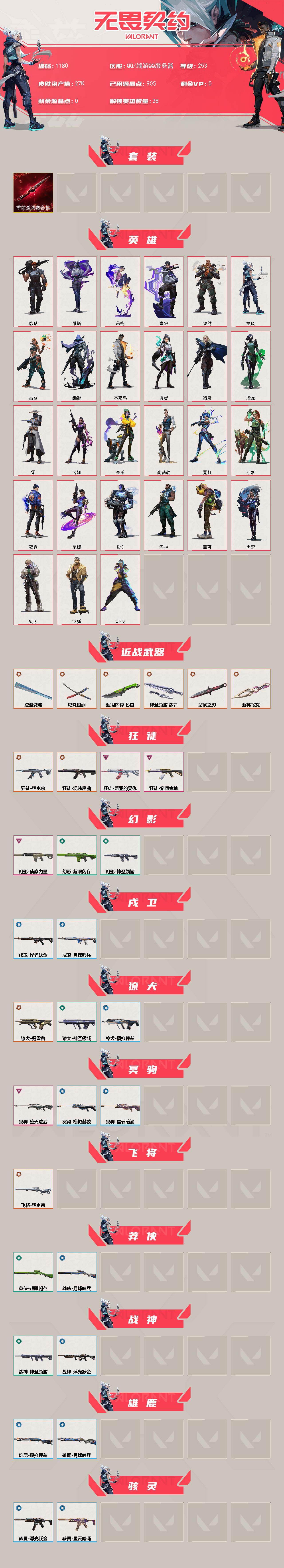 [16057571]【套装】:无畏契约季前邀请赛套装 【英雄】:幻棱,炼狱,维斯,暮蝶,钛狐,壹决,铁臂,捷风,雷兹,幽影,不死鸟,贤者,猎枭,蝰蛇,零,芮娜,奇乐,尚勃勒,霓虹,斯凯,夜露,星礈,K/O,海神,盖可,黑梦,钢锁 【近战武器】:近战武器-无畏契约季前邀请赛 悲悯之刃,近战武器-落英飞旋,近战武器-澄湖潋滟,近战武器-鬼丸国纲,近战武器-超限闪存 匕首,近战武器-神圣领域 战刀 【狂徒】:狂徒-混沌序曲,狂徒-塑水宗,狂徒-盖亚的复仇,狂徒-紫阙金琅 【幻影】:幻影-侦察力量,幻影-超限闪存,幻影-神圣领域 【戍卫】:戍卫-浮光跃金,戍卫-月球哨兵 【獠犬】:獠犬-归零者,獠犬-神圣领域,獠犬-模拟赫兹 【冥驹】:冥驹-堕天遗武,冥驹-模拟赫兹,冥驹-星云暗涌 【飞将】:飞将-塑水宗 【莽侠】:莽侠-超限闪存,莽侠-月球哨兵 【战神】:战神-神圣领域,战神-浮光跃金 【雄鹿】:雄鹿-模拟赫兹,雄鹿-月球哨兵 【骇灵】:骇灵-浮光跃金,骇灵-星云暗涌 【蜂刺】:蜂刺-超限闪存,蜂刺-星云暗涌 【标配】:标配-超能偶像,标配-浮光跃金 【正义】:正义-西部未来,正义-超限闪存,正义-复古浪潮,正义-纳米打击,正义-游戏结束,正义-月球哨兵 【鬼魅】:鬼魅-盖世英雄,鬼魅-流星兵团,鬼魅-诡秘蛇影,鬼魅-模拟赫兹,鬼魅-星云暗涌 【狂怒】:狂怒-神圣领域 【短炮】:短炮-梦魇恶魔 【卡面】:终章:激斗汉堡 卡面,进入射程 卡面,《双城之战》拥抱 卡面,精灵大战 卡面,欢迎来到底城 卡面,南瓜盛典 卡面,VCT CN首冠 卡面,唱片的故事 卡面,钢弓与箭弦 卡面,无畏契约:暮蝶 卡面,排除故障 卡面,战术桌游 卡面,悠享食光 卡面,修车达人 卡面,热舞环节 卡面,模拟赫兹 卡面,浮光跃金 卡面,超限闪存 卡面,维斯工牌 卡面,正义的化身 卡面,终章:生意人麦宝 卡面,铁之华 卡面,时间到 卡面,最高舞台 卡面,声感陷阱设计图 卡面,梦幻奶茶 卡面,终章:打造专属狂徒 卡面,趁热吃 卡面,源能反应 卡面,暂别喧嚣 卡面,零点嗅探设计图 卡面,终章:瓦娃脸雪糕 卡面,表象之下 卡面,沙雕爆能器 卡面,无畏契约GO!第一卷:芮娜 卡面,清除名单 卡面,无畏契约GO!第一卷:零 卡面,《双城之战》金克丝 卡面,钢锁vs盖可 卡面,代号红色 卡面,新兵报到 卡面,V契约 卡面,无畏契约