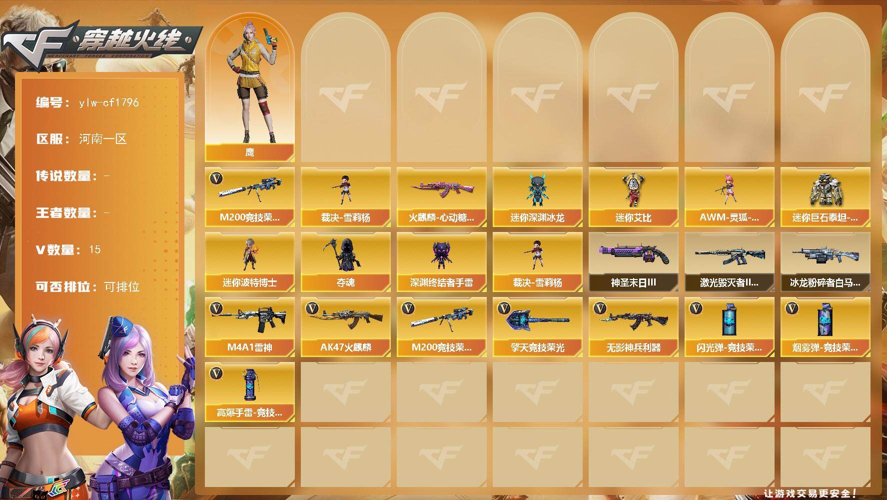 [16059084]河南一区-15V-0王者-0炫金 【热门武器】:M200-竞技荣光,裁决-雪莉杨 【稀有皮肤】:火麒麟-心动糖果 【角色】:鹰 【人偶武器】:裁决-雪莉杨,AWM-灵狐-15周年嘉年华,迷你深渊冰龙,迷你艾比,迷你巨石泰坦-魔花研究所,迷你波特博士,夺魂,深渊终结者手雷 【挑战大师】:神圣爆裂者-末日III,激光毁灭者III-白马银枪,冰龙粉碎者-白马银枪 【英雄级武器】:M200-竞技荣光,擎天-竞技荣光*2,高爆手雷-竞技荣光*3,烟雾弹-竞技荣光*2,闪光弹-竞技荣光*2,无影-神兵利器,M4A1-雷神,AK47-火麒麟