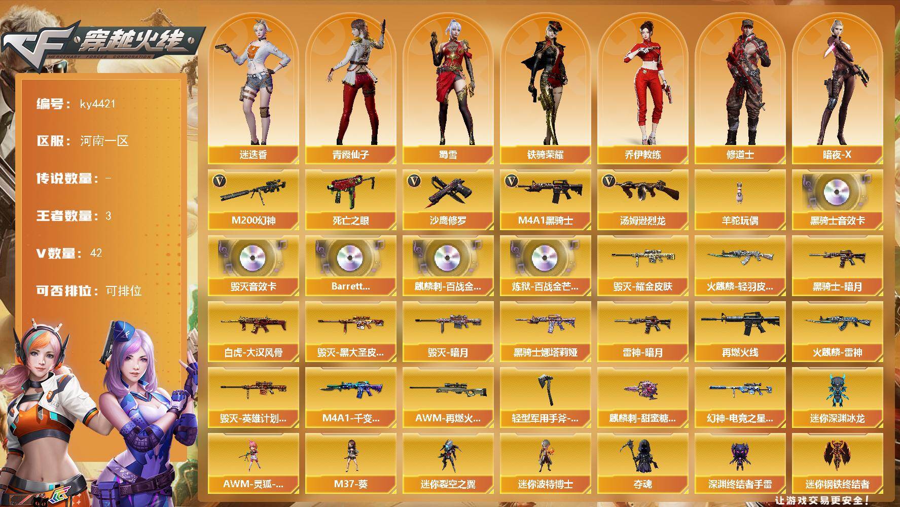 [16060114]河南一区-42V-3王者-0炫金 【热门武器】:M200-幻神,死亡之眼*2,M4A1-黑骑士,汤姆逊-烈龙,羊驼玩偶,沙鹰-修罗*2 【音效卡】:M4A1-黑骑士音效卡,Barrett-毁灭音效卡,Barrett-碧霄极光音效卡,麒麟刺-百战金芒-盛典舞曲音效卡,炼狱-百战金芒-庆典舞曲音效卡 【皮肤】:幻神-电竞之星 皮肤,白虎-大汉风骨,雷神-暗月,M4A1-再燃火线,火麒麟-雷神,火麒麟-轻羽皮肤,毁灭-暗月,毁灭耀金皮肤,毁灭-黑大圣皮肤,毁灭-英雄计划 皮肤,M4A1-千变-孔明皮肤,黑骑士-暗月,M4A1-黑骑士-娜塔莉娅 皮肤,AWM-再燃火线,轻型军用手斧-再燃火线,麒麟刺-甜蜜糖果 皮肤 【角色】:迷迭香,乔伊教练,修道士,暗夜-X,北极狐-X,芳心审判者,风暴女,嘉年华灵狐,娟娟,灵狐者-黄金海岸,麻雀,曼陀罗-X,潘多拉-X,潘多拉-甜心教官,邱刚敖,青霞仙子,斯沃特-X,蜀雪,铁骑荣耀,新娜塔莎,雪莉杨-摸金校尉,影武者-X 【人偶武器】:迷你钢铁终结者,AWM-灵狐-15周年嘉年华*2,M37-葵,迷你深渊冰龙*3,迷你裂空之翼,迷你波特博士*2,夺魂,深渊终结者手雷 【暴走生化】:死亡之眼*2 【挑战大师】:AK47-冰龙粉碎者,冰龙粉碎者-白马银枪*2,激光毁灭者III,神圣爆裂者-末日III*2 【英雄级武器】:AK47-火麒麟,M4A1-黑龙,M4A1-雷神,M4A1-黑骑士,AK47-机械迷城,M4A1-龙血,无影-神兵利器,QBZ03-独角-III,王者之心-觉醒版,黑骑士-海王,王者风势-觉醒版,Barrett-毁灭,M200-幻神,炼狱-百战金芒,汤姆逊-烈龙,沙鹰-修罗*2,天神-动感闪耀,龙啸,马来剑-夜魔,麒麟刺,斩神刀-雷暴,麒麟刺-百战金芒,高爆手雷-雷霆,高爆手雷-雷暴,高爆手雷-夜魔,手雷-动感闪耀,闪光弹-雷霆,闪光弹-雷暴,闪光弹-夜魔,闪光弹-竞技荣光,烟雾弹-雷霆,烟雾弹-雷暴,烟雾弹-夜魔,M4A1-苍鸣雷神,Barrett-碧霄极光 【道具】:BS战队炫彩背包,CFS限定背包,亚洲杯纪念炫彩背包,全能枪王背包,百战金芒炫彩背包,超级背包,女皇终结者-魔龙之吻,妩媚妖姬,绿色巨人,灵魂忍者*2,变异宝贝,迷雾幽灵,生化弹匣,夺命之镰*2,防化服*3,金色流光-枪王排位,星辰流光-枪王排位,流光-鎏