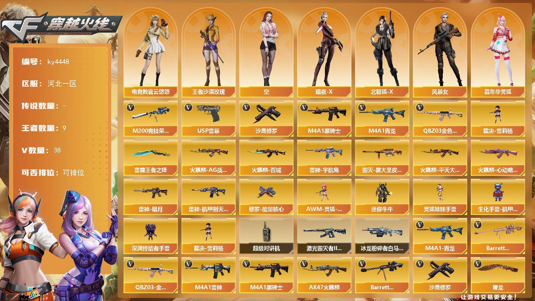 [16060812]河北一区-38V-9王者-0炫金 【热门武器】:QBZ03-金色蔷薇,M4A1-青龙,M200-竞技荣光*2,M4A1-黑骑士,裁决-雪莉杨,USP-雷暴,沙鹰-修罗 【王者炫金武器】:雷霆王者之锋 【皮肤】:雷神-暗月,雷神-机甲刑天皮肤,雷神-宇航兔皮肤,火麒麟-AG战队皮肤,火麒麟-平天大圣,火麒麟-百城,火麒麟-心动糖果,毁灭-黑大圣皮肤,修罗-能量核心 【角色】:电竞教官-云悠悠,王者沙漠玫瑰,空,暗夜-X,北极狐-X,风暴女*2,嘉年华灵狐,灵狐者-黄金海岸,灵狐者-七夕宝贝,龙儿-小淘气,潘多拉-甜心教官,潜龙队-X,斯沃特-X,新娜塔莎,樱-战斗天使,影武者-X 【人偶武器】:裁决-雪莉杨,AWM-灵狐-15周年嘉年华,迷你牛牛,生化手雷-机甲核心,深渊终结者手雷,灵狐娃娃手雷 【暴走生化】:超级对讲机 【挑战大师】:冰龙粉碎者-白马银枪,激光毁灭者III-白马银枪 【英雄级武器】:AK47-火麒麟,M4A1-雷神,M4A1-黑骑士,M4A1-青龙,无影-神兵利器,QBZ03-金色蔷薇,王者之武-觉醒版,AK-47-猩红传说*2,Barrett-毁灭,M200-竞技荣光*2,Barrett-金色蔷薇,沙鹰-修罗,USP-雷暴,COP 357-雷霆王者-觉醒版,柯尔特-竞技荣光,屠龙,擎天-竞技荣光*5,高爆手雷-竞技荣光*5,闪光弹-幻灵,闪光弹-竞技荣光*5,闪光弹-雷霆王者-觉醒版*2,烟雾弹-竞技荣光*5,烟雾弹-雷霆王者-觉醒版*2,M4A1-赤狱骑士 【道具】:亚洲杯纪念炫彩背包,炫彩背包,背包-洛丽塔,裂空之翼背包-金色,超级背包,救世主-黑桃战神,绿色巨人,灵魂忍者,变异宝贝,迷雾幽灵,生化弹匣,夺命之镰,防化服*2,金色流光-枪王排位*2,星辰流光-枪王排位,枪王排位28赛季金色流光,枪王排位29赛季金色流光,斯沃特表情,防弹头盔*4,防弹衣*3,C4工具钳*2,手雷包*3 【特殊枪械】:1黑骑士