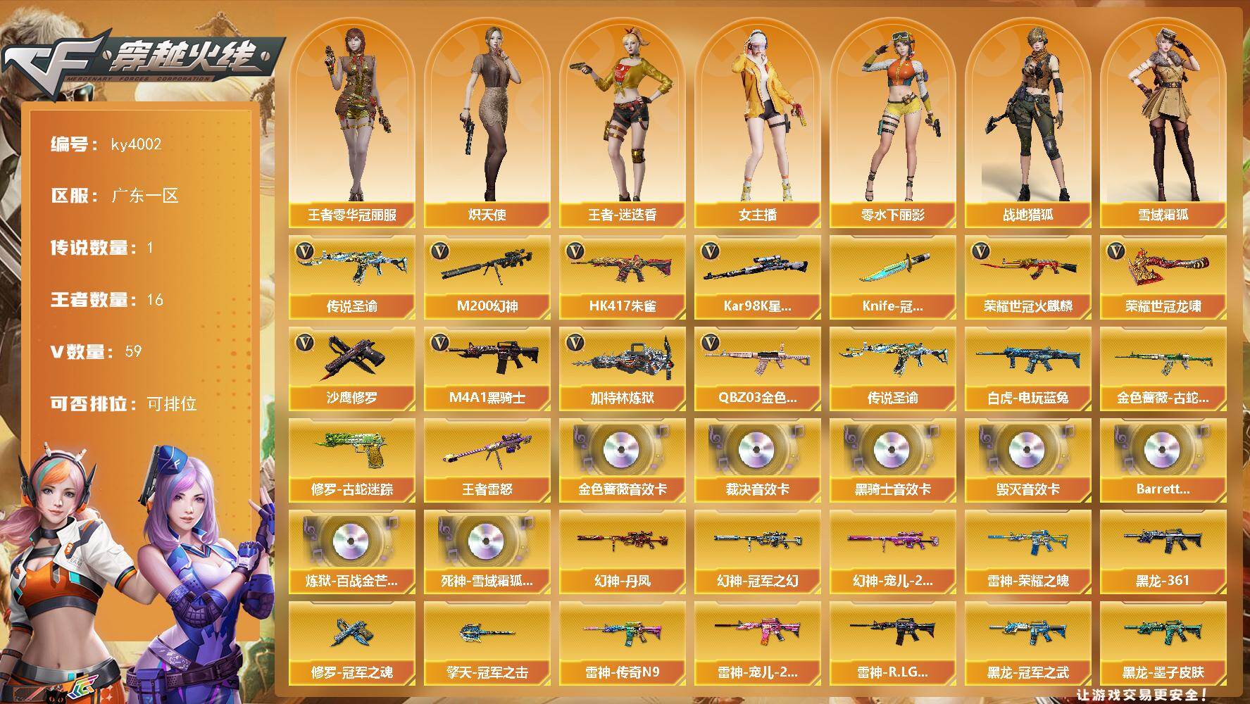 [16061497]广东一区-59V-16王者-0炫金 【传说武器】:传说圣谕 【热门武器】:传说圣谕,QBZ03-金色蔷薇*2,HK417-朱雀,M200-幻神,金色蔷薇-古蛇迷踪,修罗-古蛇迷踪,荣耀世冠-火麒麟,白虎-电玩蓝兔,Kar98K-星神,M4A1-黑骑士,加特林-炼狱,沙鹰-修罗*2,Knife-冠军之刃*2,荣耀世冠-龙啸 【王者炫金武器】:王者雷怒 【音效卡】:M4A1-黑骑士音效卡,Barrett-毁灭音效卡,QBZ03-金色蔷薇音效卡,AWM-裁决音效卡,Barrett-碧霄极光音效卡*4,炼狱-百战金芒-庆典舞曲音效卡,死神-雪域霜狐-怀旧音效卡 【皮肤】:幻神-冠军之幻,幻神-丹凤,幻神-宠儿-2021MVP,M200-幻神-N9-2022MVP,幻神-电流骇客 皮肤,幻神-荣耀世冠EP 皮肤,QBZ03-荣耀世冠白鲨,裁决-流光秘银,雷神-暗月,雷神-荣耀之魄,雷神-传奇N9,雷神-宠儿-2019MVP,雷神-R.LGD-CFPLS18冠军,雷神-化蛇 皮肤,M4A1-再燃火线,火麒麟-巅峰荣耀,火麒麟-心动糖果,毁灭-冠军之怒,毁灭-QQ会员,毁灭-英雄计划 皮肤,M4A1-千变-孔明皮肤,M4A1-黑龙-361,黑龙-墨子皮肤,黑龙-冠军之武,黑骑士-AG-S4冠军典藏,黑骑士-破界 皮肤,死神-机甲核心皮肤,战神-紫绶金章皮肤,AK47-B-常胜将军-刘备,AK47-B-常胜将军-孙权,AWM-天龙-传奇70KG,AWM-天龙-传奇白鲨,修罗-冠军之魂,修罗-15周年嘉年华 皮肤,屠龙-QQ会员,屠龙-巅峰荣耀 皮肤,轻型军用手斧-再燃火线,擎天-冠军之击,麒麟刺-萌杀皮肤 【角色】:战地猎狐,王者零-华冠丽服,王者-迷迭香,雪域霜狐,蛇隐宗,奇洋探员,乔伊教练,修道士,云海玲珑,炽天使,暗夜-X,初恋灵狐,芳心审判者,虎妞,嘉年华灵狐,猎狐者-追月,零-水下丽影,灵狐-花神,灵狐者-X,流浪蔷薇,龙儿-小淘气,麻雀,曼陀罗-X,曼陀罗-礼服,萌儿,女主播,潘多拉-X,潘多拉-甜心教官,蛇姬,斯沃特-X,雪莉杨-摸金校尉,游珑儿 【人偶武器】:火麒麟-灵狐,海滩汪汪-巴雷特,迷你深渊冰龙,迷你裂空之翼,迷你超能女侍 【暴走生化】:超级对讲机 【挑战大师】:冰龙粉碎者-白马银枪,激光毁灭者III-白马银枪*2,机甲撕裂者III,神圣爆裂者-末日III