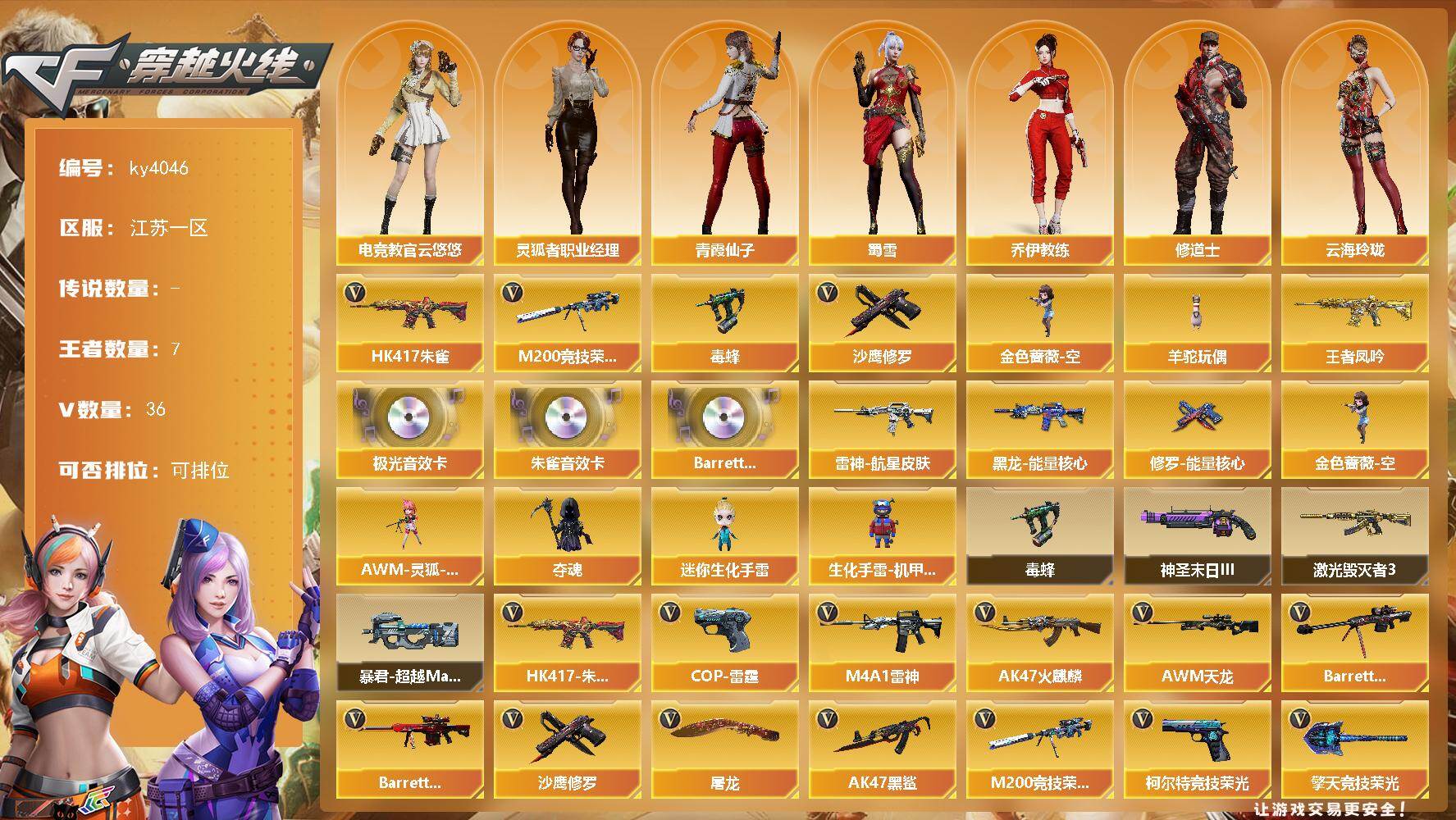 [16061575]江苏一区-36V-7王者-0炫金 【热门武器】:HK417-朱雀,M200-竞技荣光,毒蜂,金色蔷薇-空,羊驼玩偶,沙鹰-修罗*2 【王者炫金武器】:王者凤吟 【音效卡】:Barrett-极光音效卡,HK417-朱雀音效卡,Barrett-碧霄极光音效卡*2 【皮肤】:雷神-航星皮肤,黑龙-能量核心,修罗-能量核心 【角色】:电竞教官-云悠悠,乔伊教练,修道士,云海玲珑,北极狐-X,初恋灵狐,虎妞,嘉年华灵狐,娟娟,灵狐者-职业经理,麻雀,潘多拉-X,青霞仙子,斯沃特-X,蜀雪,新娜塔莎,雪莉杨-摸金校尉,影武者-X 【人偶武器】:金色蔷薇-空,AWM-灵狐-15周年嘉年华,夺魂,迷你生化手雷,生化手雷-机甲核心 【暴走生化】:毒蜂 【挑战大师】:暴君乱世-超越Max,激光毁灭者III,神圣爆裂者-末日III 【英雄级武器】:AK47-火麒麟,M4A1-雷神,AK47-黑鲨,HK417-朱雀,无影-神兵利器,烈火-动感闪耀,超新星-悦享-觉醒版,王者芳薇-觉醒版,AWM-天龙,Barrett-毁灭,Barrett-极光,M200-竞技荣光,王者风神-觉醒版,王者凰鸣-觉醒版,沙鹰-修罗*2,COP-雷霆,柯尔特-竞技荣光,天神-动感闪耀,屠龙,擎天-竞技荣光*2,屠龙-动感闪耀,王者之击-觉醒版,高爆手雷-竞技荣光*5,手雷-动感闪耀,闪光弹-竞技荣光*5,闪光弹-雷霆王者-觉醒版,烟雾弹-竞技荣光*5,M4A1-赤狱骑士 【道具】:CFS限定背包,女皇终结者-背包,炫彩背包,老虎背包,超级背包,哔哩哔哩名片,女皇终结者-魔龙之吻,绿色巨人,灵魂忍者,迷雾幽灵,夺命之镰,防化服*2,金色流光-枪王排位*2,星辰流光-枪王排位,流光-鎏金之域,枪王排位28赛季金色流光,枪王排位29赛季金色流光,动感闪耀表情,EP战队名片,EP战队喷图,EP战队击杀图标,防弹头盔*7,防弹衣*7,C4工具钳*7,手雷包*7 【特殊枪械】: