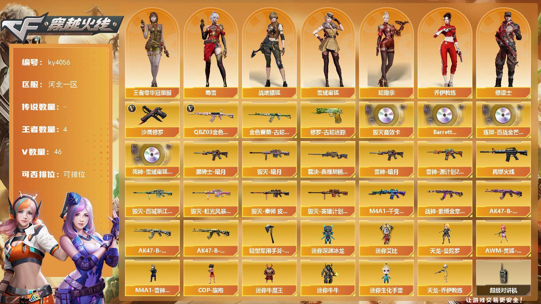 [16061618]河北一区-46V-4王者-0炫金 【热门武器】:QBZ03-金色蔷薇,金色蔷薇-古蛇迷踪,修罗-古蛇迷踪,沙鹰-修罗 【音效卡】:Barrett-毁灭音效卡,Barrett-碧霄极光音效卡,炼狱-百战金芒-庆典舞曲音效卡,死神-雪域霜狐-怀旧音效卡 【皮肤】:裁决-典雅胡桃 皮肤,雷神-暗月,雷神-源计划2.0专属 皮肤,M4A1-再燃火线,毁灭-暗月,毁灭-百城浙江 皮肤,毁灭-虹光风暴 皮肤,毁灭-秦师 皮肤,毁灭-英雄计划 皮肤,M4A1-千变-孔明皮肤,黑骑士-暗月,战神-紫绶金章皮肤,AK47-B-常胜将军-曹操,AK47-B-常胜将军-刘备,AK47-B-常胜将军-孙权,轻型军用手斧-再燃火线 【角色】:战地猎狐,王者零-华冠丽服,雪域霜狐,蛇隐宗,奇洋探员,乔伊教练,修道士,云海玲珑,暗夜-X,初恋灵狐,电竞少女,芳心审判者,嘉年华灵狐,娟娟,兰-海滩派对,兰-新年限定,兰妹妹,猎狐者-追月,0号玩家,灵狐者-X,曼陀罗-X,潘多拉-X,潘多拉-甜心教官,蛇姬,斯沃特-X,蜀雪,兔囡囡,新娜塔莎,樱-战斗天使,游珑儿 【人偶武器】:天龙-曼陀罗,M4A1-雷神-精英刀锋,天龙-乔伊教练,AWM-灵狐-15周年嘉年华,COP-旗袍,迷你深渊冰龙,迷你牛魔王,迷你牛牛,迷你生化手雷,迷你艾比 【暴走生化】:超级对讲机 【挑战大师】:AK47-冰龙粉碎者,冰龙粉碎者-白马银枪,激光毁灭者III-白马银枪,神圣爆裂者-末日III 【英雄级武器】:AK47-火麒麟*2,M4A1-雷神*3,无影-神兵利器,黑武士-锦绣游龙,金色蔷薇-古蛇迷踪,死神-雪域霜狐,QBZ03-独角-III,QBZ03-金色蔷薇,烈火-动感闪耀,黑骑士-海王,AK47-B-常胜将军,王者猎神-觉醒版,Barrett-毁灭,AWM-裁决,炼狱-百战金芒,沙鹰-修罗,沙鹰-天神*2,天神-动感闪耀,修罗-古蛇迷踪,幻灵之锋,屠龙-动感闪耀,斩神刀-雷暴,麒麟刺-百战金芒,高爆手雷-雷暴,高爆手雷-幻灵,高爆手雷-云龙,高爆手雷-古蛇迷踪,闪光弹-雷暴,闪光弹-幻灵,闪光弹-云龙,烟雾弹-雷暴*2,烟雾弹-幻灵,烟雾弹-云龙,烟雾弹-古蛇迷踪,M4A1-赤狱骑士,M4A1-苍鸣雷神,AWM-昌龙,Barrett-碧霄极光*2 【道具】:BS战队炫彩背包,CFS限定背包,云山科技背包,亚洲杯纪