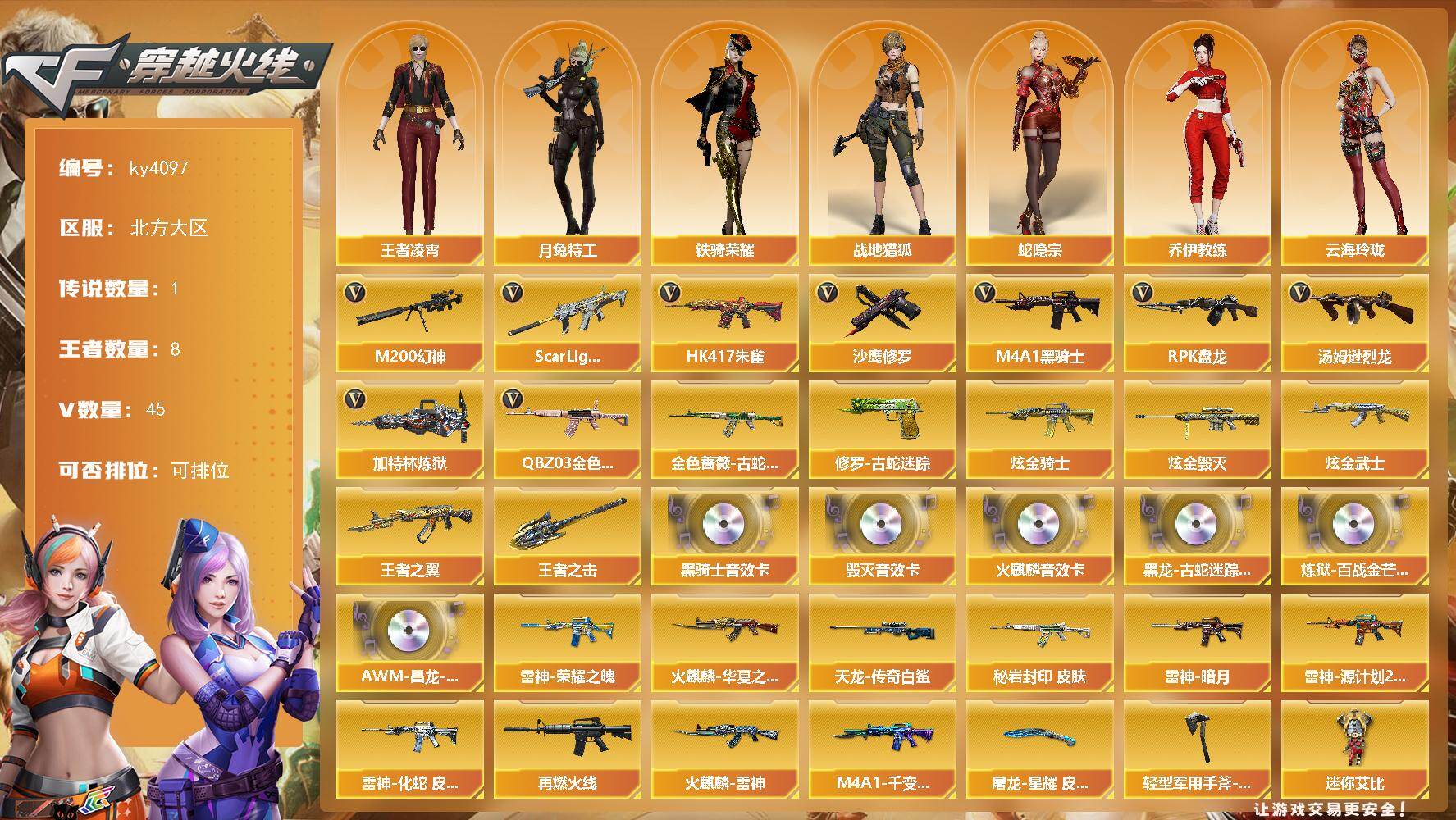 [16061744]北方大区-45V-8王者-4炫金 【传说角色】:传说星骇 【热门武器】:QBZ03-金色蔷薇,Scar Light-白虎,HK417-朱雀,M200-幻神,金色蔷薇-古蛇迷踪,修罗-古蛇迷踪,M4A1-黑骑士,汤姆逊-烈龙,RPK-盘龙,加特林-炼狱*5,沙鹰-修罗*2 【王者炫金武器】:王者之翼,王者之击,炫金骑士,炫金武士,炫金毁灭*2 【音效卡】:黑龙-古蛇迷踪音效卡,AK47-火麒麟音效卡,M4A1-黑骑士音效卡,Barrett-毁灭音效卡,炼狱-百战金芒-庆典舞曲音效卡,AWM-昌龙-怀旧音效卡 【皮肤】:金色蔷薇-秘岩封印 皮肤,雷神-暗月*2,雷神-荣耀之魄,雷神-源计划2.0专属 皮肤,雷神-化蛇 皮肤,M4A1-再燃火线,火麒麟-雷神,火麒麟-华夏之心,M4A1-千变-孔明皮肤,AWM-天龙-传奇白鲨,屠龙-星耀 皮肤,轻型军用手斧-再燃火线 【角色】:月兔特工,战地猎狐,王者凌霄,蛇隐宗,奇洋探员,乔伊教练,云海玲珑,暗夜-X,北极狐-X,芳心审判者,风暴女,龙儿,潘多拉-甜心教官,潜龙队-X,蛇姬,斯沃特-X,铁骑荣耀,兔囡囡,新娜塔莎,影武者-X 【人偶武器】:迷你波特博士,夺魂,迷你牛牛,迷你火种,生化手雷-机甲核心*2,迷你艾比 【暴走生化】:超级对讲机 【挑战大师】:冰龙粉碎者-白马银枪*2,试炼破坏者III,神圣爆裂者-末日III 【英雄级武器】:AK47-火麒麟,AK47-麒麟,M4A1-黑龙,M4A1-雷神,M4A1-黑骑士,AK47-黑武士,AN94-超新星,AK47-黑鲨,HK417-朱雀,Scar Light-白虎,无影-神兵利器,金色蔷薇-古蛇迷踪,QBZ03-金色蔷薇,王者之势-觉醒版,黑骑士-海王,AWM-天龙,Barrett-毁灭,M200-幻神,RPK-盘龙,加特林-炼狱*5,炼狱-百战金芒,汤姆逊-烈龙,AA-12-雷霆,沙鹰-修罗*2,修罗-古蛇迷踪,屠龙,龙啸,幻灵之锋,擎天-竞技荣光*2,麒麟刺-百战金芒,高爆手雷-雷暴,高爆手雷-幻灵,高爆手雷-古蛇迷踪,闪光弹-雷暴,闪光弹-幻灵,闪光弹-竞技荣光,闪光弹-雷霆王者-觉醒版*2,烟雾弹-雷暴,烟雾弹-幻灵,烟雾弹-古蛇迷踪,烟雾弹-雷霆王者-觉醒版,M4A1-赤狱骑士 【道具】:CFS限定背包,云山科技背包,亚洲杯纪念炫彩背包,古蛇迷踪炫彩背包,女皇终