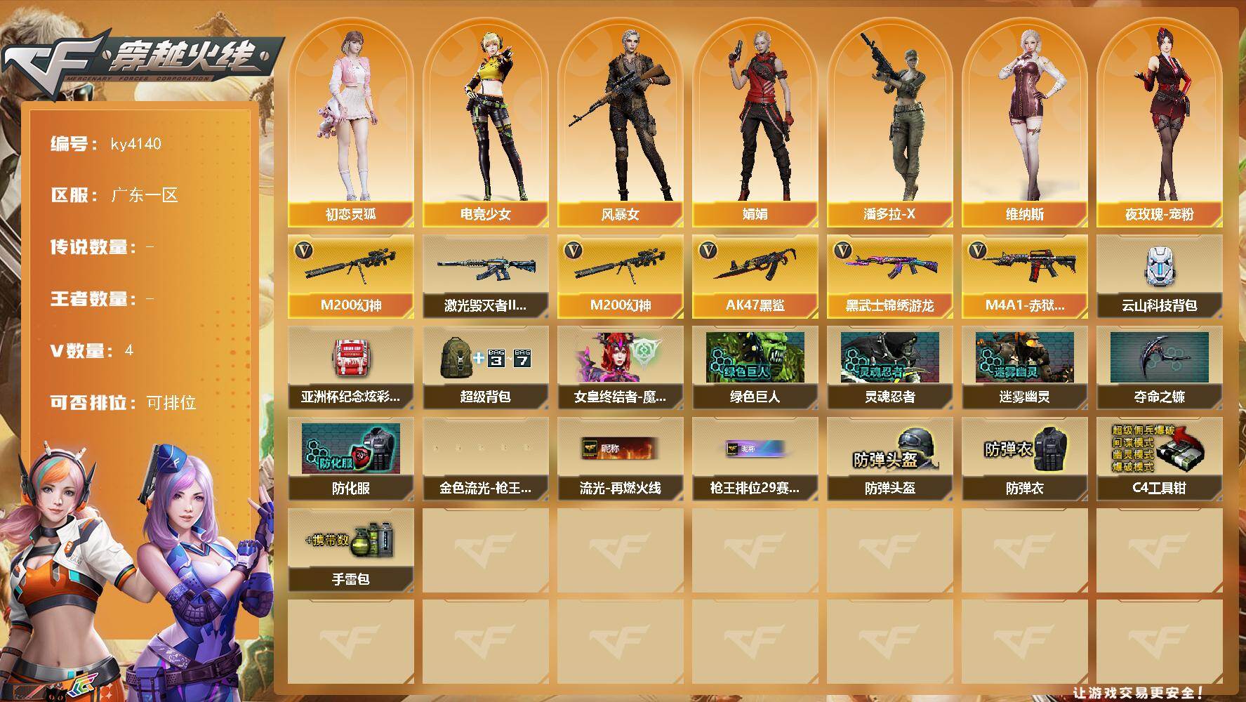 [16061887]广东一区-4V-0王者-0炫金 【热门武器】:M200-幻神 【角色】:初恋灵狐,电竞少女,风暴女,娟娟,0号玩家,潘多拉-X,维纳斯,夜玫瑰-宠粉 【挑战大师】:激光毁灭者III-白马银枪 【英雄级武器】:AK47-黑鲨,黑武士-锦绣游龙,M200-幻神,M4A1-赤狱骑士 【道具】:云山科技背包,亚洲杯纪念炫彩背包,超级背包,女皇终结者-魔龙之吻,绿色巨人,灵魂忍者,迷雾幽灵,夺命之镰,防化服*3,金色流光-枪王排位,星辰流光-枪王排位,流光-再燃火线,枪王排位28赛季金色流光,枪王排位29赛季金色流光,防弹头盔*5,防弹衣*5,C4工具钳*5,手雷包*5 【特殊枪械】: