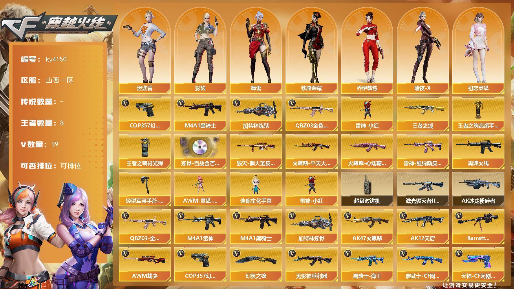 [16061961]山西一区-39V-8王者-0炫金 【热门武器】:QBZ03-金色蔷薇,M4A1-黑骑士*2,加特林-炼狱,雷神-小红,COP 357-幻灵 【王者炫金武器】:王者之城,王者之魄高爆手雷*3,王者之魄闪光弹*3 【音效卡】:炼狱-百战金芒-庆典舞曲音效卡 【皮肤】:雷神-维纳斯皮肤,M4A1-再燃火线,火麒麟-平天大圣,火麒麟-心动糖果,毁灭-黑大圣皮肤,轻型军用手斧-再燃火线 【角色】:迷迭香,影豹,乔伊教练,暗夜-X,初恋灵狐,嘉年华灵狐,娟娟,灵狐-花神,灵狐者-X,潘多拉-X,蜀雪,铁骑荣耀,雪莉杨 【人偶武器】:雷神-小红,AWM-灵狐-15周年嘉年华*2,迷你生化手雷 【暴走生化】:超级对讲机 【挑战大师】:AK47-冰龙粉碎者,激光毁灭者III-白马银枪 【英雄级武器】:AK47-火麒麟,M4A1-雷神,M4A1-黑骑士*2,AK12-天启,无影-神兵利器,QBZ03-金色蔷薇,黑骑士-海王,黑武士-CF网剧冠军,Barrett-毁灭*2,AWM-裁决,王者幻神-觉醒版,加特林-炼狱,COP 357-幻灵,天神-CF网剧冠军,幻灵之锋,擎天-CF网剧冠军,麒麟刺-百战金芒,高爆手雷-幻灵*5,闪光弹-幻灵*5,烟雾弹-幻灵*6 【道具】:BS战队炫彩背包,炫彩背包,百战金芒炫彩背包,女皇终结者-魔龙之吻,绿色巨人,灵魂忍者,变异宝贝,迷雾幽灵,夺命之镰,防化服*3,金色流光-枪王排位*2,星辰流光-枪王排位,枪王排位29赛季金色流光,语音特效-盛典烟火,萌萌小葵表情,EP战队击杀图标,防弹头盔*3,防弹衣*3,C4工具钳*3,手雷包*3 【特殊枪械】:2黑骑士,1炼狱