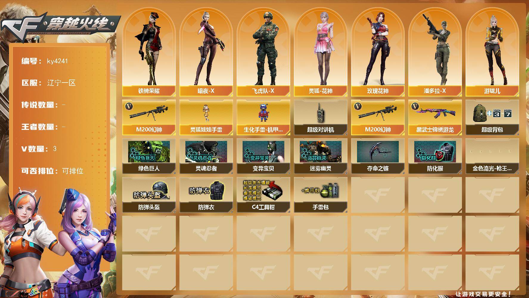 [16062363]辽宁一区-3V-0王者-0炫金 【热门武器】:M200-幻神 【角色】:暗夜-X,飞虎队-X,灵狐-花神,玫瑰花神,潘多拉-X,铁骑荣耀,游珑儿 【人偶武器】:生化手雷-机甲核心,灵狐娃娃手雷 【暴走生化】:超级对讲机 【英雄级武器】:黑武士-锦绣游龙,M200-幻神 【道具】:超级背包,绿色巨人,灵魂忍者*2,变异宝贝,迷雾幽灵*2,夺命之镰,防化服*3,金色流光-枪王排位,星辰流光-枪王排位,枪王排位28赛季金色流光,防弹头盔*3,防弹衣*3,C4工具钳*3,手雷包*3 【特殊枪械】: