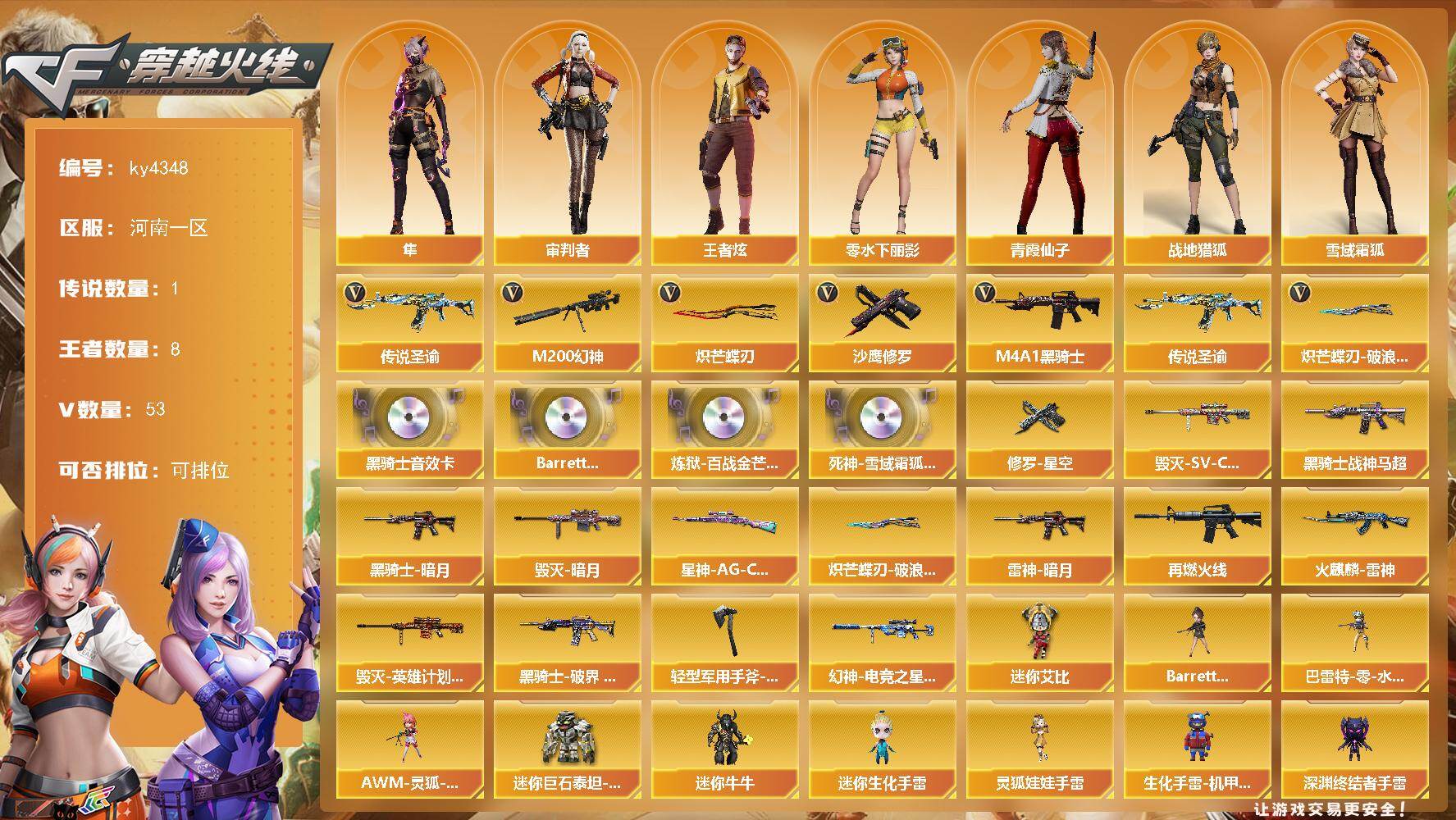 [16062781]河南一区-53V-8王者-0炫金 【传说武器】:传说圣谕 【热门武器】:传说圣谕,M200-幻神,M4A1-黑骑士,沙鹰-修罗,炽芒蝶刃,炽芒蝶刃-破浪逐光 皮肤 【音效卡】:M4A1-黑骑士音效卡,Barrett-碧霄极光音效卡,炼狱-百战金芒-庆典舞曲音效卡,死神-雪域霜狐-怀旧音效卡 【皮肤】:幻神-电竞之星 皮肤,Kar98K-星神-AG-CFPLS21冠军皮肤,雷神-暗月,M4A1-再燃火线,火麒麟-雷神,毁灭-暗月,毁灭-SV-CFPLS16冠军,毁灭-英雄计划 皮肤,黑骑士-暗月,黑骑士-战神马超,黑骑士-破界 皮肤,修罗-星空,轻型军用手斧-再燃火线,炽芒蝶刃-破浪逐光 皮肤 【角色】:隼,审判者,战地猎狐,王者炫,雪域霜狐,奇洋探员,乔伊教练,暗夜-X,初恋灵狐,电竞少女,芳心审判者,飞虎队-X,风暴女,嘉年华灵狐,娟娟,兰-海滩派对,猎狐者-追月,0号玩家,零-水下丽影,灵狐者-X,龙儿,龙儿-小淘气,麻雀,曼陀罗-X,潘多拉-X,潘多拉-甜心教官,青霞仙子,蛇姬,兔囡囡,新娜塔莎,樱-战斗天使,影武者-X,游珑儿 【人偶武器】:星神-炽天使,巴雷特-零-水下丽影,加特林-机械猎手,AWM-灵狐-15周年嘉年华,迷你牛牛*2,迷你生化手雷,生化手雷-机甲核心*3,深渊终结者手雷,Barrett-夜玫瑰,迷你艾比,迷你巨石泰坦-魔花研究所,灵狐娃娃手雷*3 【暴走生化】:双面神 【挑战大师】:冰龙粉碎者-白马银枪*2,神圣爆裂者-末日III 【英雄级武器】:M4A1-雷神,M4A1-黑骑士,M4A1-幻灵,无影-神兵利器,黑武士-锦绣游龙,超新星-热带奇洋,死神-雪域霜狐,烈火-动感闪耀,黑骑士-海王,Barrett-毁灭,M200-幻神,炼狱-百战金芒,沙鹰-修罗,天神-动感闪耀,幻灵之锋*2,擎天-竞技荣光,炽芒蝶刃,屠龙-动感闪耀,龙啸-热带奇洋,斩神刀-雷暴,麒麟刺-百战金芒,雷霆王者之锋-觉醒版,高爆手雷-雷暴,高爆手雷-幻灵,高爆手雷-竞技荣光*3,手雷-动感闪耀,手雷-热带奇洋,高爆手雷-玄豹*2,闪光弹-雷暴,闪光弹-竞技荣光*3,闪光弹-云龙,闪光弹-玄豹*2,烟雾弹-雷暴,烟雾弹-竞技荣光*3,烟雾弹-玄豹*2,烟雾弹-雷霆王者-觉醒版*2,M4A1-赤狱骑士,M4A1-苍鸣雷神,Barrett-碧霄极光 【道具】:CFS限定