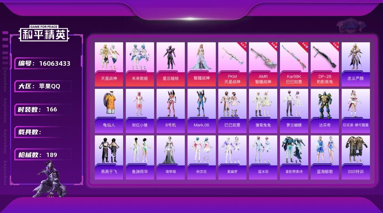 [16063433]【特价出售/店主推荐】苹果 手Q-4粉装-4特效枪-0载具-0粉色飞行器-61211热力值-9王牌印记-166套装-189枪皮