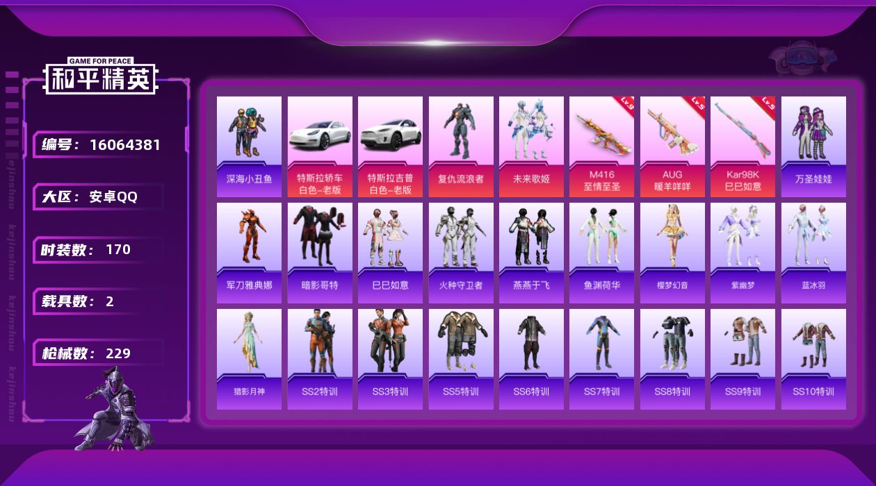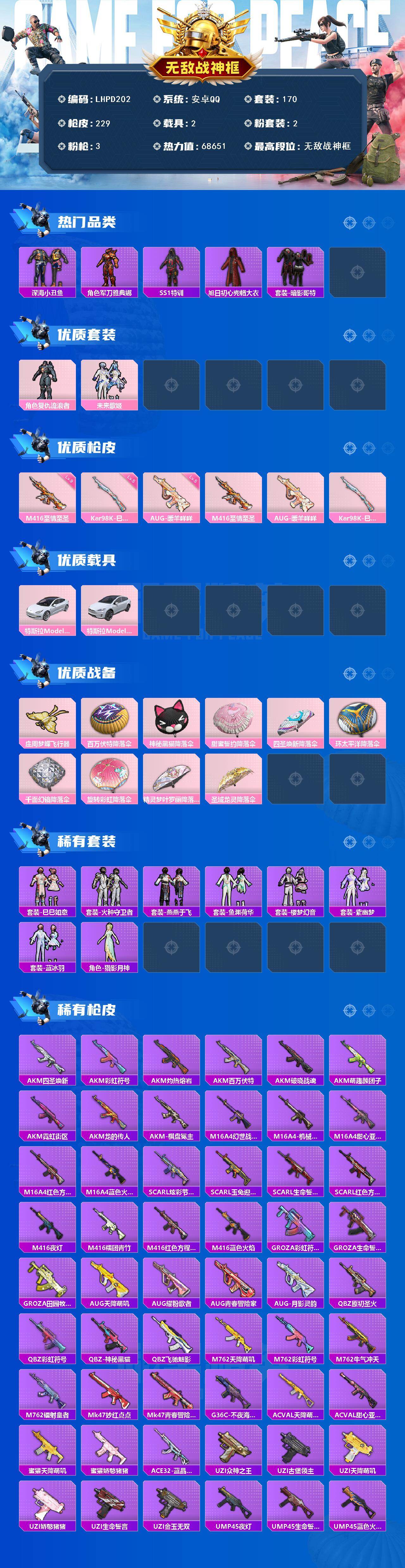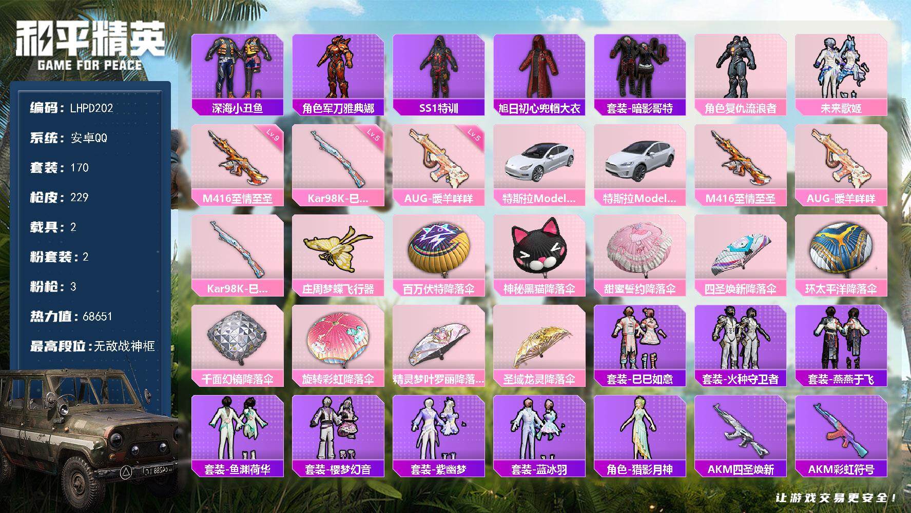 [16064381]【特价出售/店主推荐】安卓 手Q-无敌战神框-2粉装-3特效枪-2载具-1粉色飞行器-68651热力值-12王牌印记-170套装-229枪皮【热门品类】:套装-深海小丑鱼,角色-军刀雅典娜,套装-SS1特训,旭日初心兜帽大衣,套装-暗影哥特【粉色套装】:角色-复仇流浪者,粉装-未来歌姬【粉色枪皮等级】:M416-至情至圣(九级),AUG-暖羊咩咩(五级),Kar98K-巳巳如意(五级)【粉色载具】:特斯拉Model 3(珍珠白),特斯拉Model X(珍珠白)【粉色枪皮】:M416-至情至圣,AUG-暖羊咩咩,Kar98K-巳巳如意【粉色飞行器】:庄周梦蝶飞行器